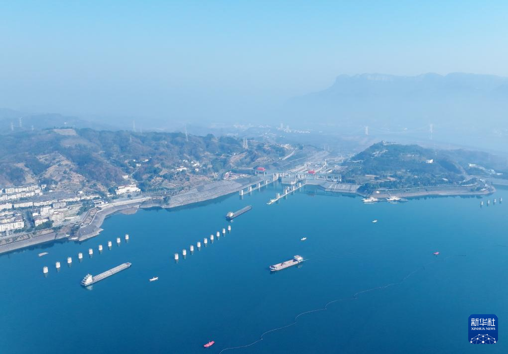 2025年1月1日,船舶有序通过三峡升船机(无人机照片)。新华社发(郑家裕摄)