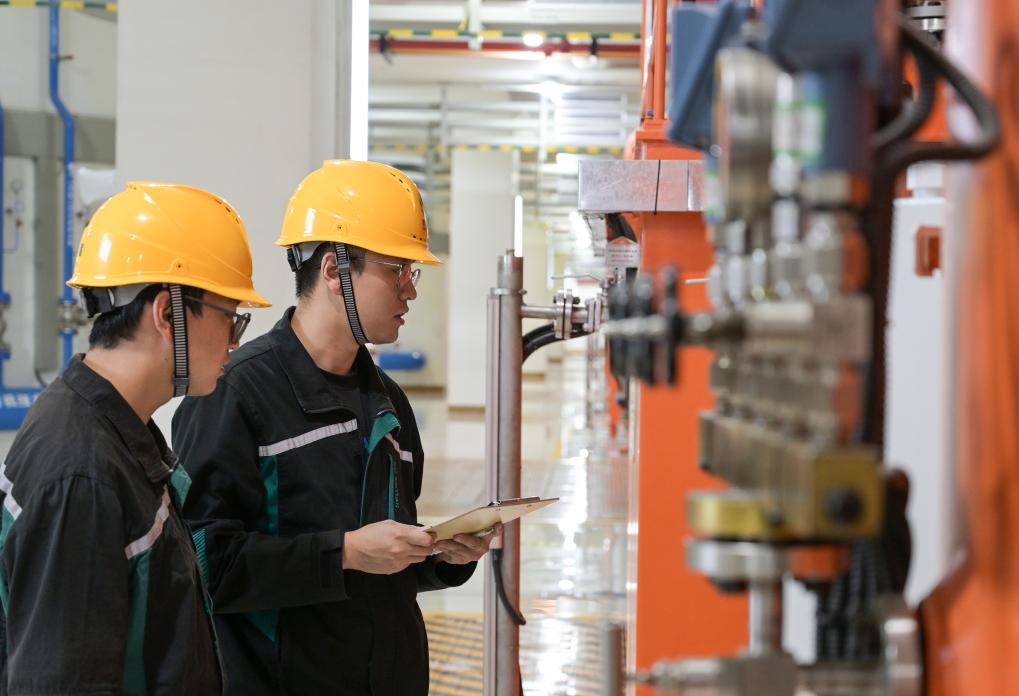 在丰宁抽水蓄能电站地下厂房内,工作人员对设备进行巡检。新华社记者 李贺 摄