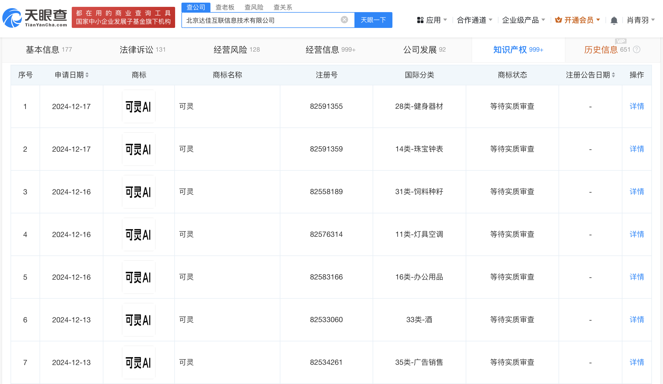 天眼查知识产权信息显示,近日,快手关联公司北京达佳互联信息技术有限公司申请注册多枚“可灵AI”商标,国际分类涉及健身器材、珠宝钟表、饲料种籽等,当前商标状态均为等待实质审查。