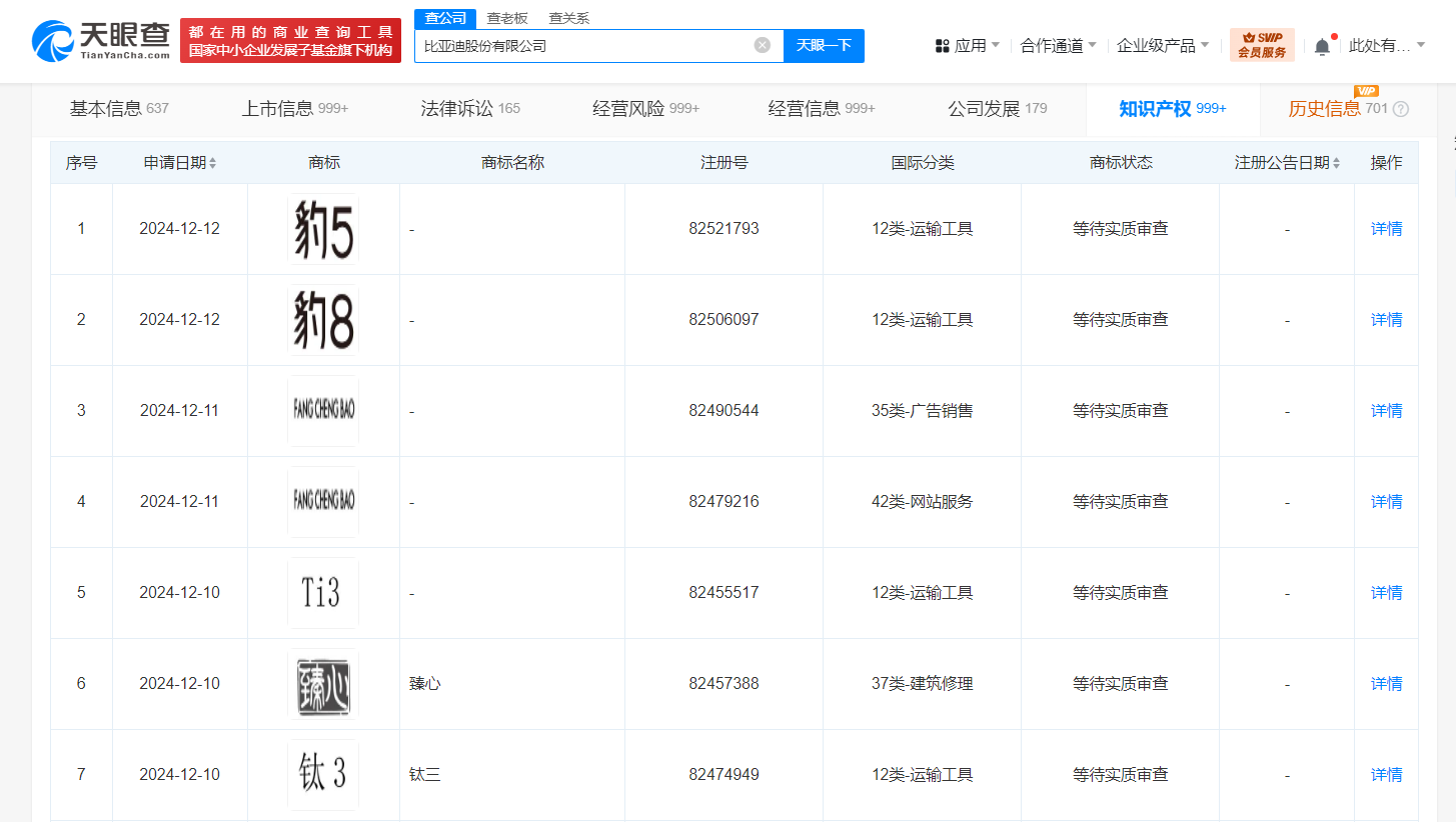 天眼查知识产权信息显示,近日,比亚迪股份有限公司申请注册“豹5”“豹8”“钛3”商标,国际分类为运输工具,当前商标状态均为等待实质审查。