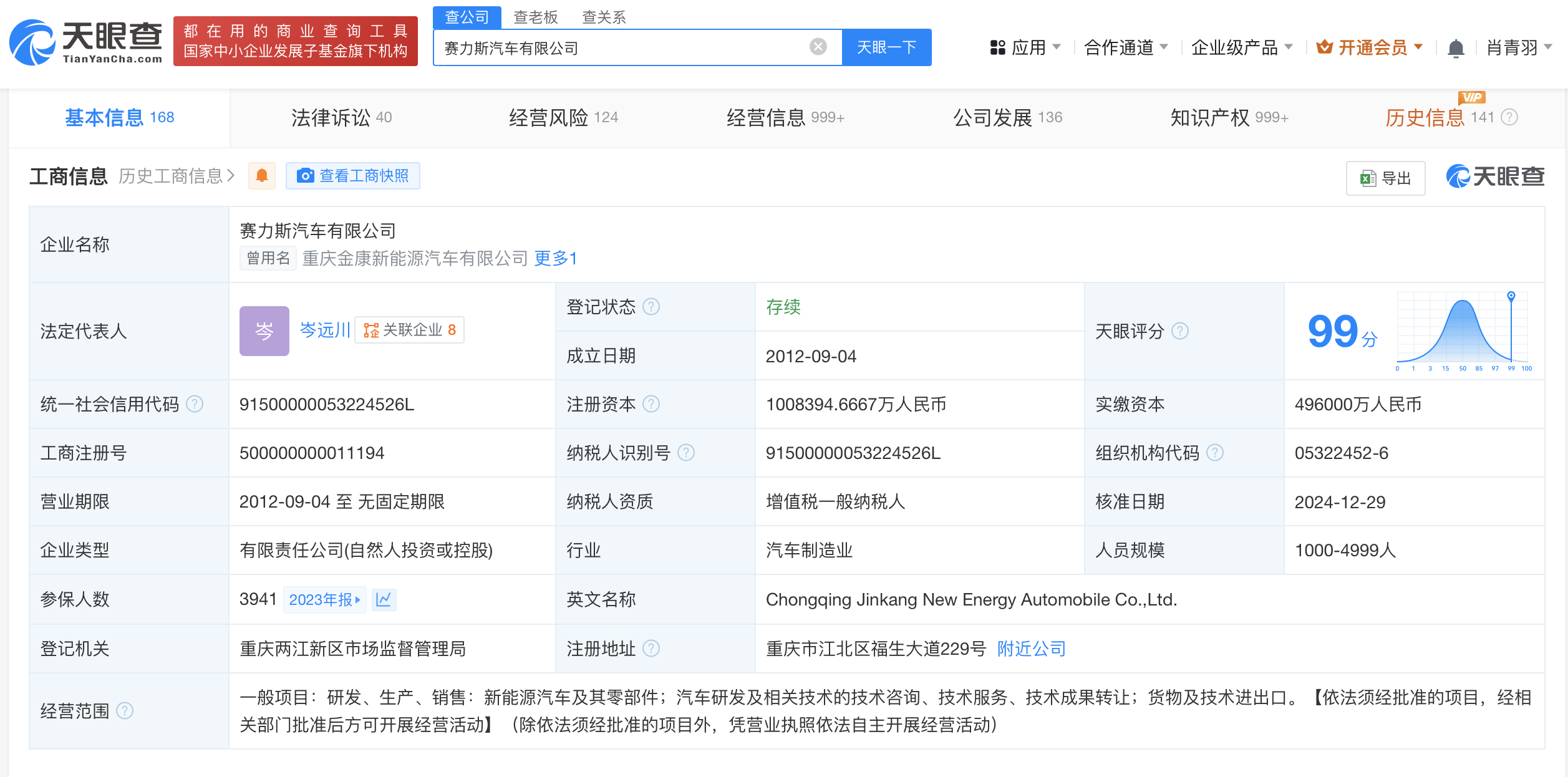 天眼查App显示,近日,赛力斯汽车有限公司发生工商变更,新增国开制造业转型升级基金(有限合伙)为股东,注册资本由99.6亿人民币增至约100.84亿人民币。