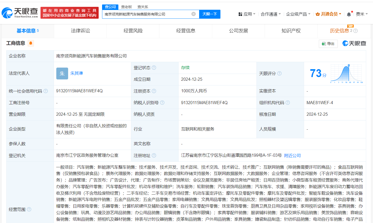 天眼查App显示,近日,南京领克新能源汽车销售服务有限公司成立,法定代表人为朱其谦,注册资本1000万人民币,经营范围含新能源汽车整车销售、票务代理服务、数据处理服务、二手车经纪、智能无人飞行器销售、智能机器人销售等,由领克汽车销售有限公司全资持股。