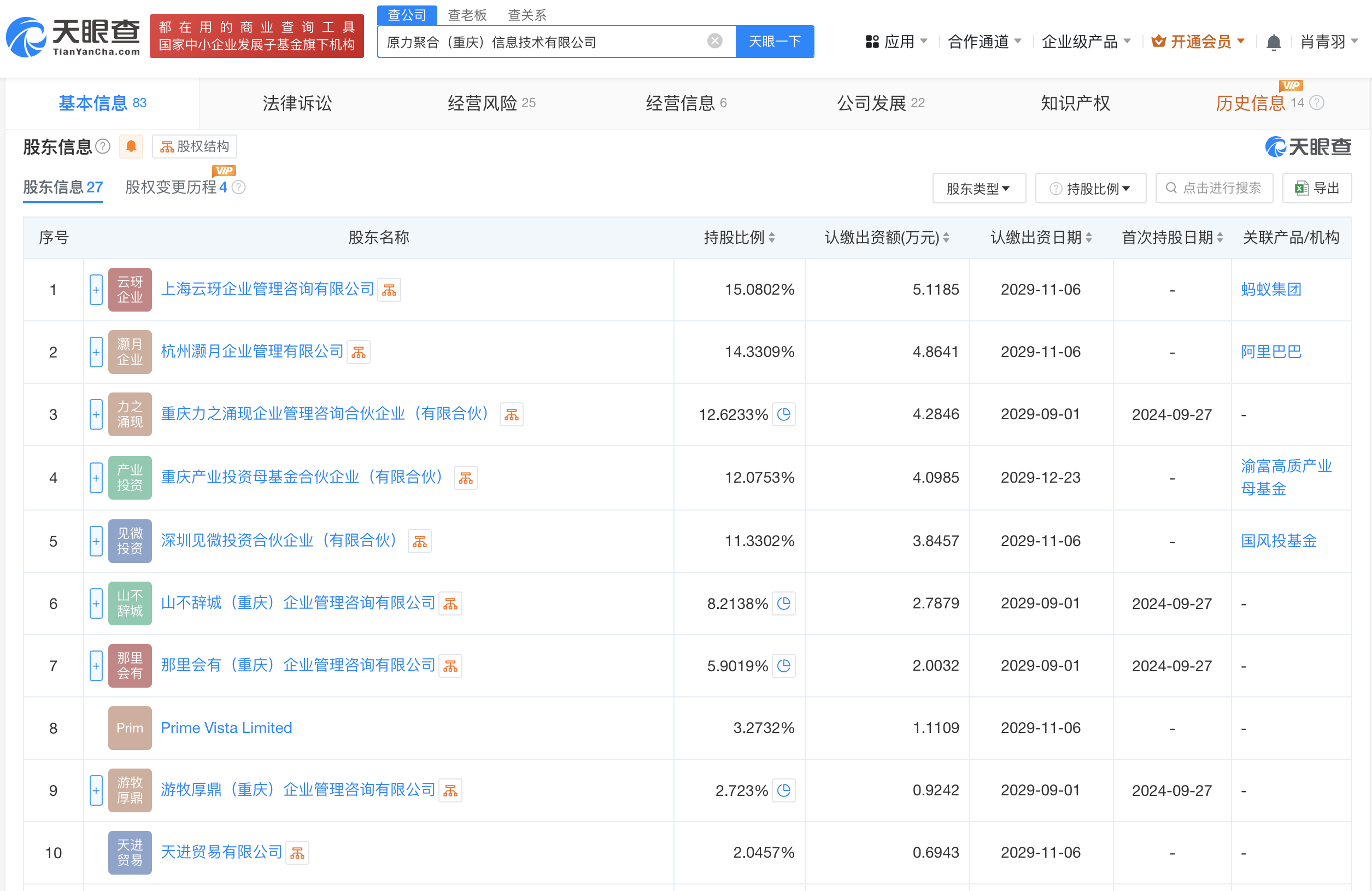 天眼查App显示,近日,原力聚合(重庆)信息技术有限公司发生工商变更,新增蚂蚁集团旗下上海云玡企业管理咨询有限公司、淘宝旗下杭州灏月企业管理有限公司、深圳见微投资合伙企业(有限合伙)等为股东,同时注册资本由约11.7万人民币增至约33.9万人民币,增幅约191%。此外,新增多位高级管理人员。