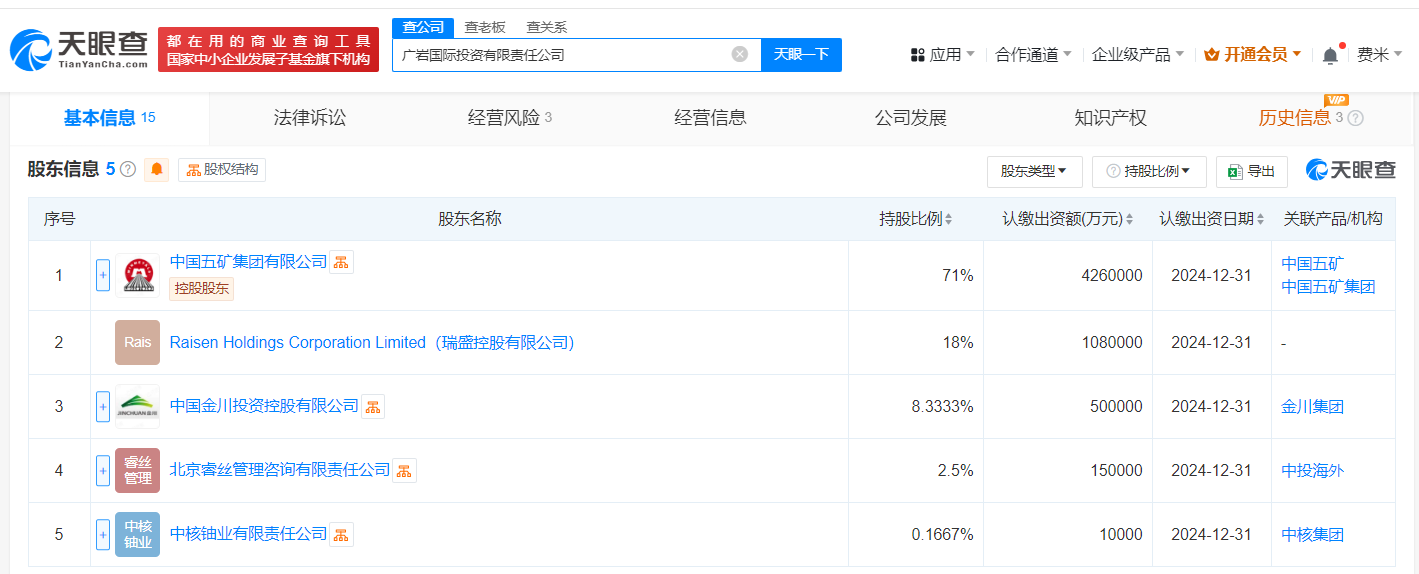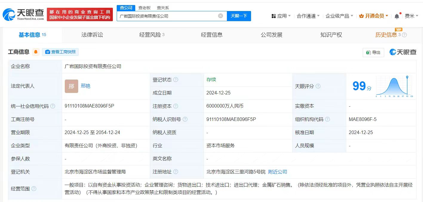 天眼查App显示,近日,广岩国际投资有限责任公司成立,法定代表人为邢艳,注册资本600亿人民币,经营范围为以自有资金从事投资活动、企业管理咨询、货物进出口、技术进出口、进出口代理、金属矿石销售,由中国五矿集团有限公司、中国金川投资控股有限公司、中核铀业有限责任公司等共同持股。
