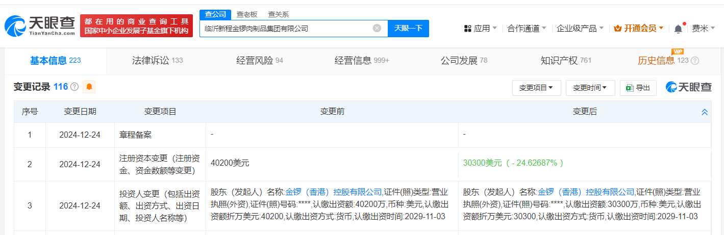 天眼查App显示,近日,临沂新程金锣肉制品集团有限公司发生工商变更,注册资本由4.02亿美元减至3.03亿美元。变更记录显示,今年9月和11月,该公司已两次减资。