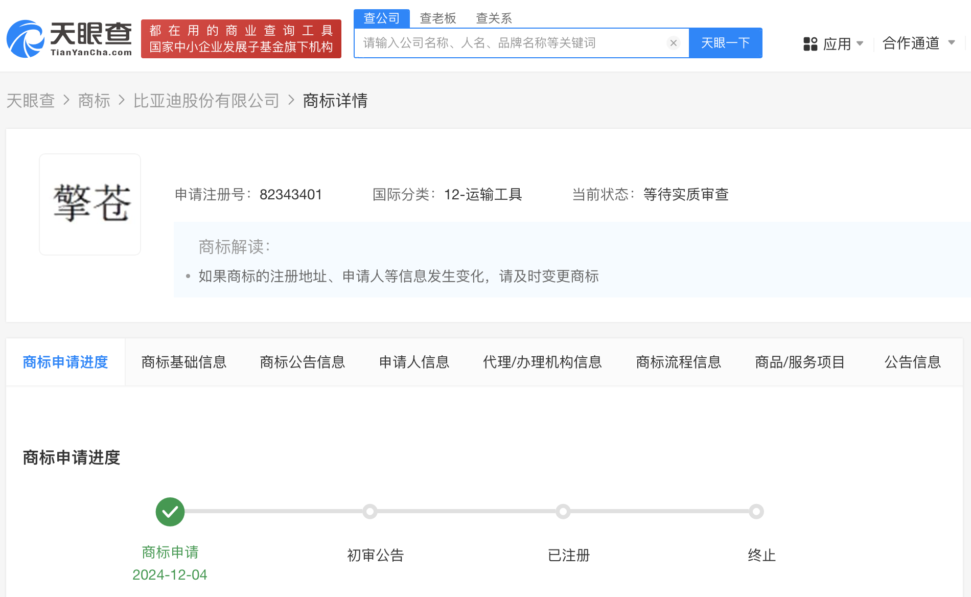 天眼查知识产权信息显示,近日,比亚迪股份有限公司申请注册多枚“擎苍”“灵鸢”“云鸢”“凌鸢”商标,国际分类涉及科学仪器、运输工具,当前商标状态均为等待实质审查。