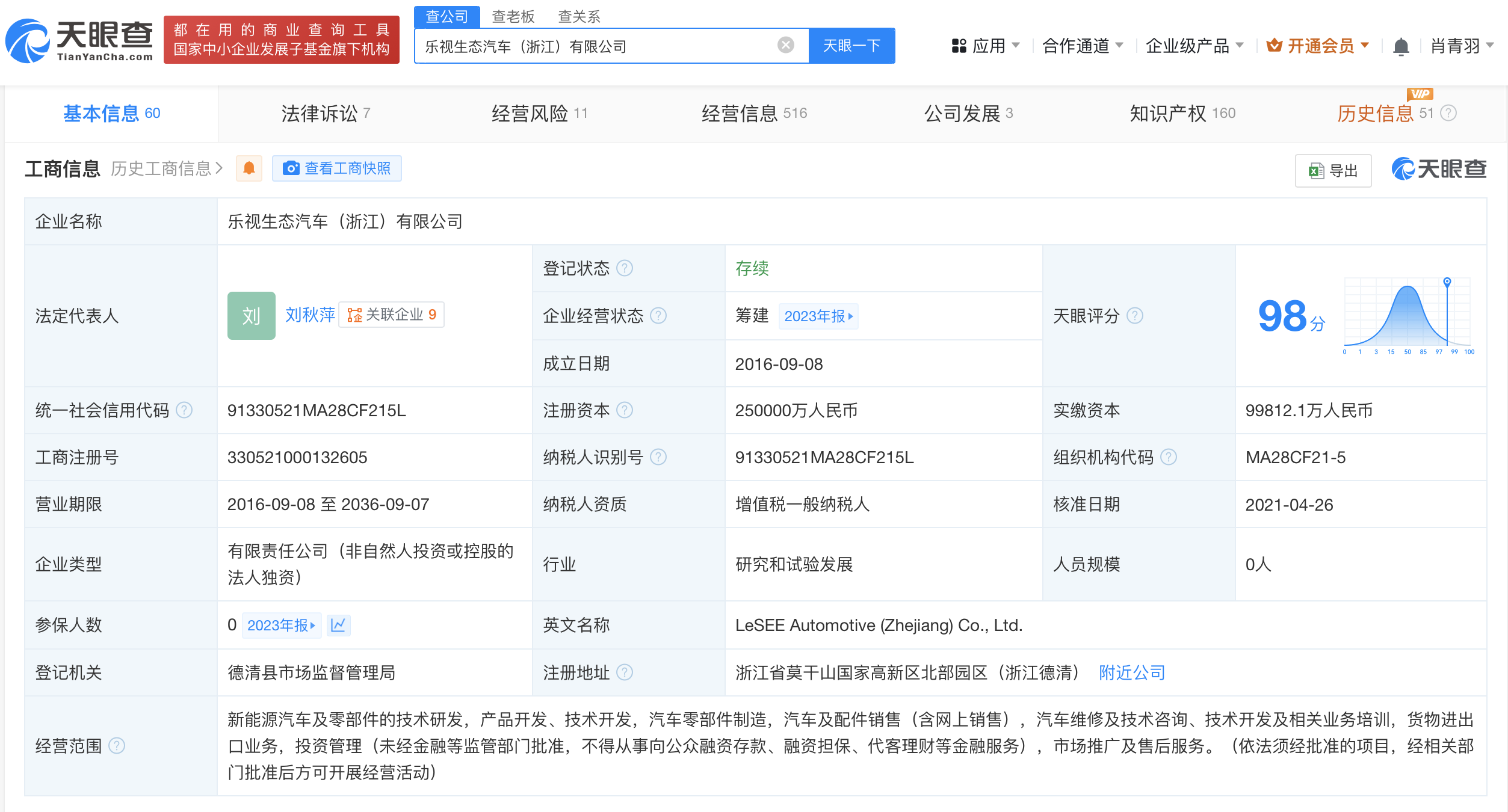 该公司成立于2016年9月,法定代表人为刘秋萍,注册资本25亿人民币,经营范围含新能源汽车及零部件的技术研发,产品开发、技术开发,汽车零部件制造,汽车维修及技术咨询等。股权全景穿透图显示,该公司由乐视汽车(北京)有限公司全资持股,后者由法法汽车(中国)有限公司、乐视致乐科技(北京)有限公司共同持股。