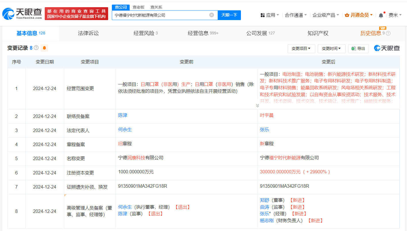 天眼查App显示,近日,宁德润康科技有限公司发生工商变更,公司名称变更为宁德福宁时代新能源有限公司,注册资本由1000万人民币增至30亿人民币,经营范围由日用口罩(非医用)生产、日用口罩(非医用)销售变更为电池制造、电池销售、新兴能源技术研发等,法定代表人由何余生变更为张乐,同时多位高管发生变更。该公司成立于2020年6月,由宁德时代(300750)全资持股。