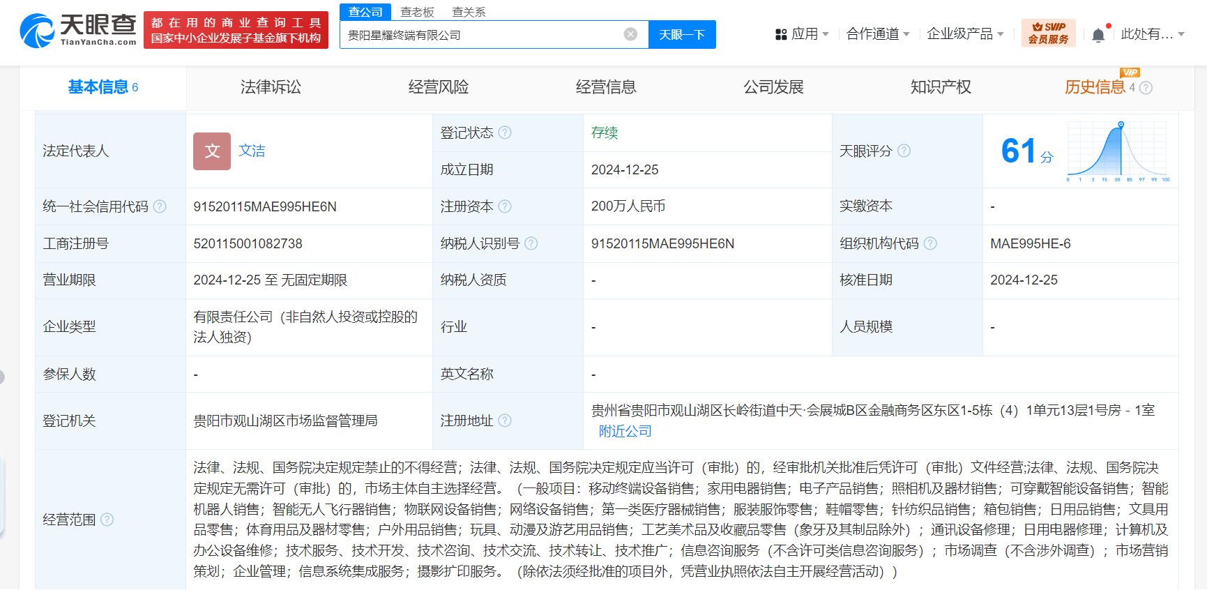 天眼查App显示,近日,贵阳星耀终端有限公司成立,法定代表人为文洁,注册资本200万人民币,经营范围含移动终端设备销售、家用电器销售、电子产品销售、智能机器人销售、智能无人飞行器销售、网络设备销售等。股权全景穿透图显示,该公司由深圳星耀终端有限公司全资持股,后者为荣耀终端有限公司全资子公司。