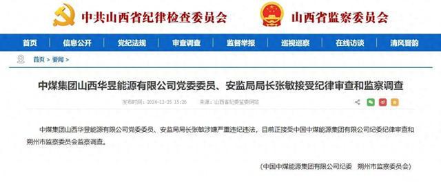 中煤集团山西华昱能源有限公司党委委员、安监局局长张敏涉嫌严重违纪违法,目前正接受中国中煤能源集团有限公司纪委纪律审查和朔州市监察委员会监察调查。