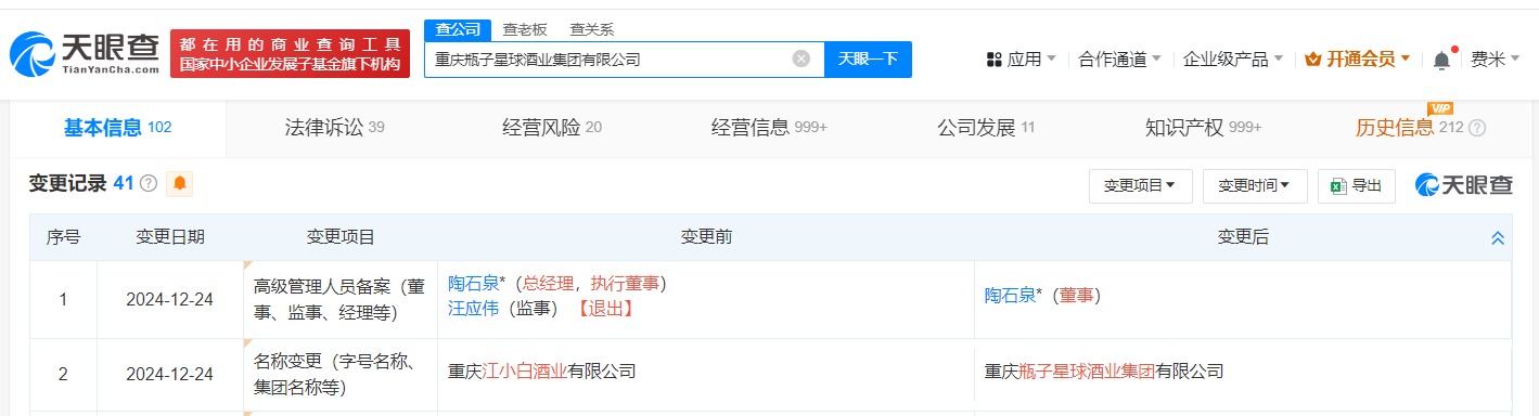 天眼查App显示,近日,重庆江小白酒业有限公司发生工商变更,公司名称变更为重庆瓶子星球酒业集团有限公司。
