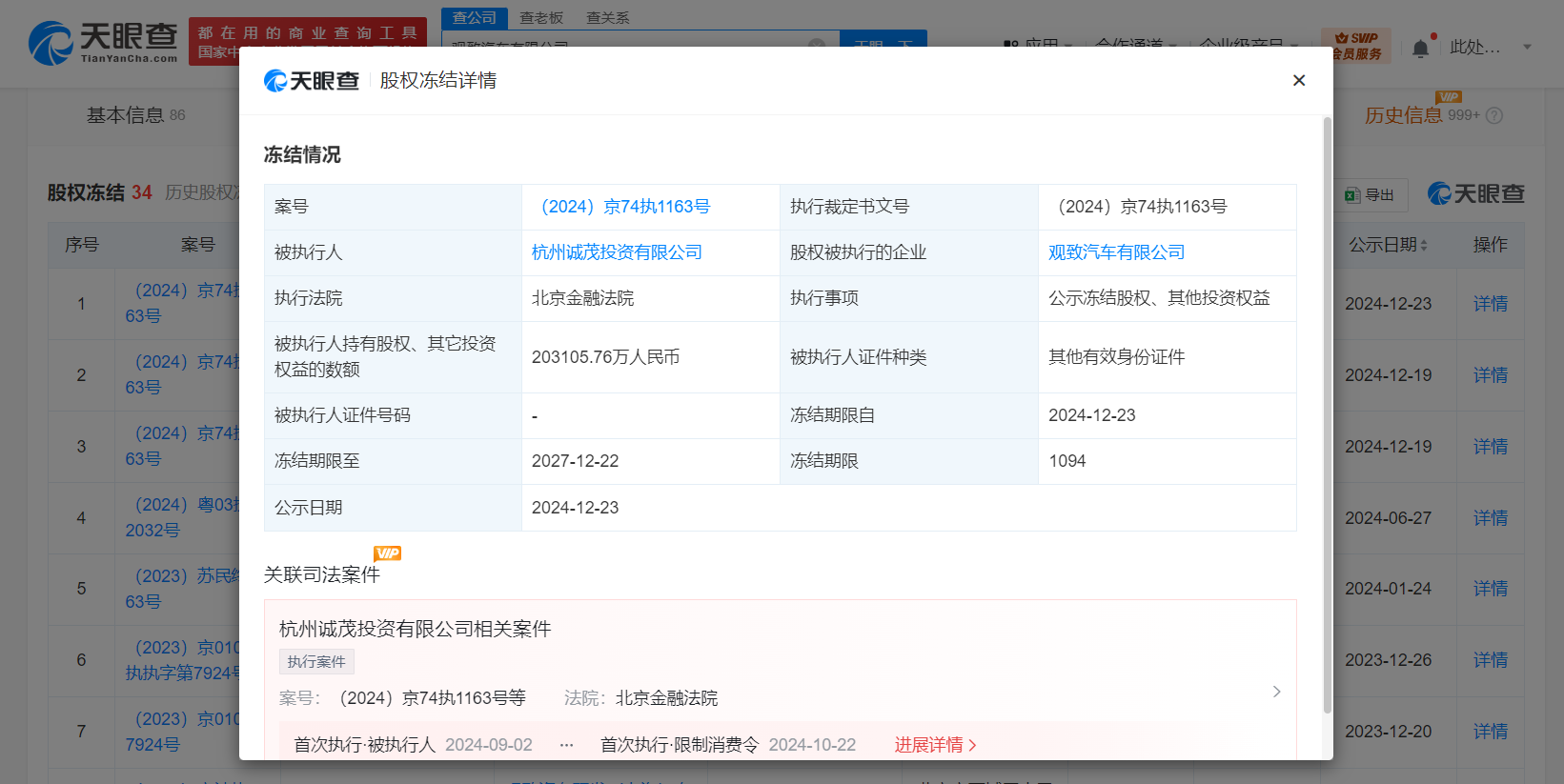 天眼查App显示,近日,观致汽车有限公司新增一条股权冻结信息,被执行人为杭州诚茂投资有限公司,冻结股权数额约20.3亿人民币,冻结期限自2024年12月23日至2027年12月22日,执行法院为北京金融法院。