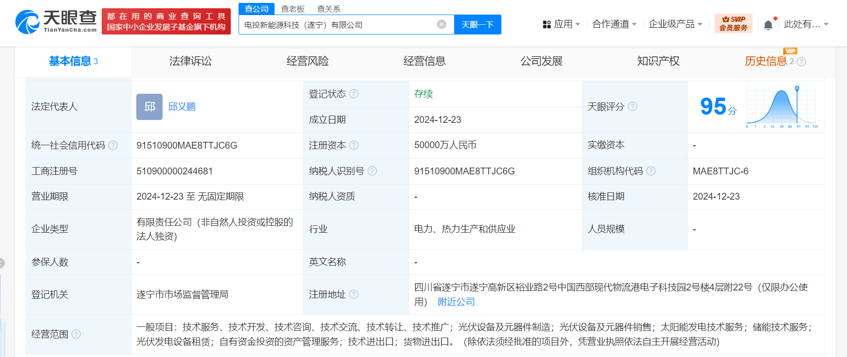 天眼查App显示,近日,电投新能源科技(遂宁)有限公司成立,法定代表人为邱义鹏,注册资本5亿人民币,经营范围含光伏设备及元器件制造、光伏设备及元器件销售、太阳能发电技术服务、储能技术服务、自有资金投资的资产管理服务等,由国电投新能源科技有限公司全资持股。