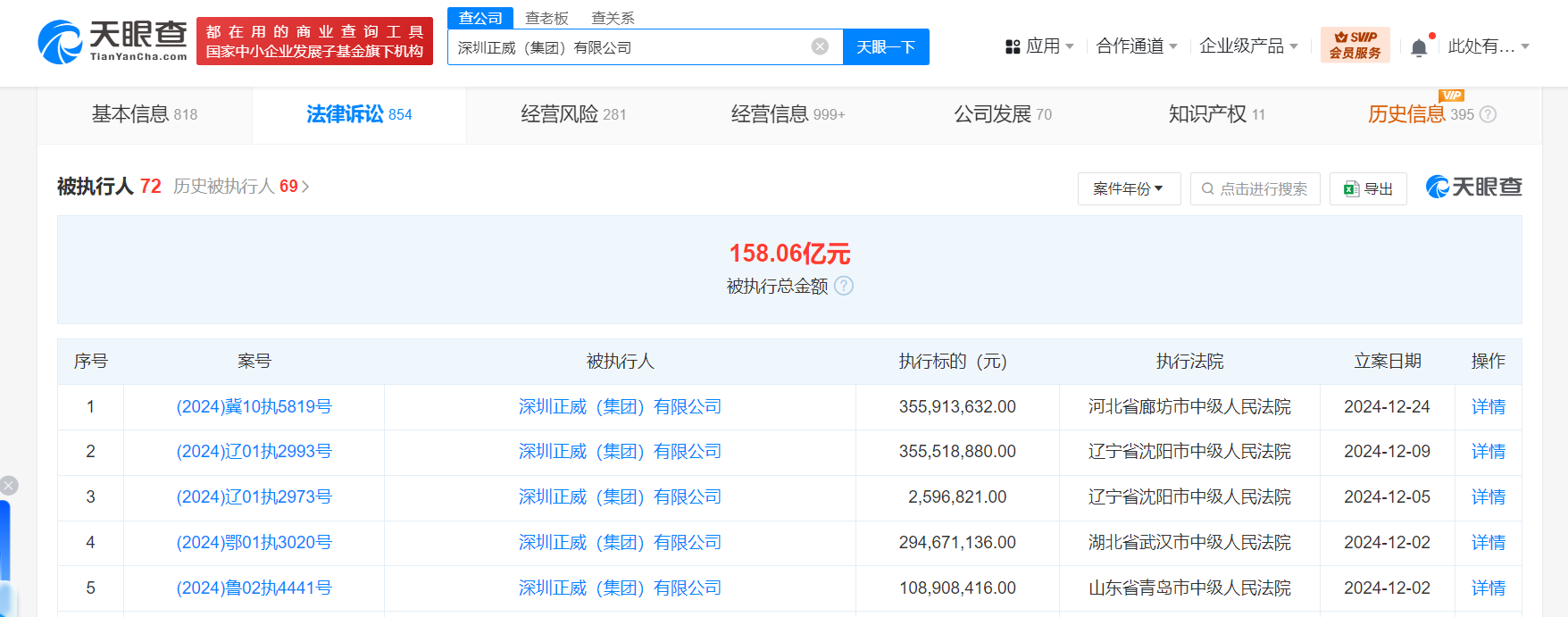 天眼风险信息显示,深圳正威(集团)有限公司现存70余条被执行人信息,被执行总金额超158亿元。此外,该公司还存在多条限制消费令、失信被执行人(老赖)和终本案件信息。