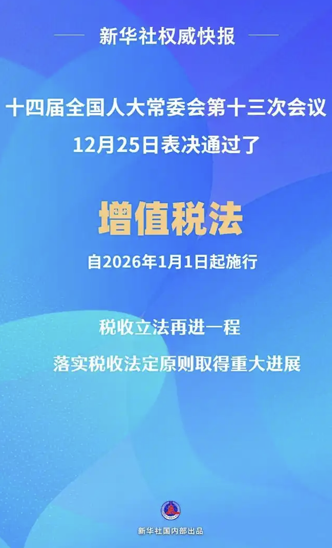 十四届全国人大常委会第十三次会议12月25日表决通过了增值税法,自2026年1月1日起施行。增值税是我国第一大税种,随着增值税法制定出台,我国现行18个税种中已有14个税种制定了法律,涵盖了绝大部分的税收收入,落实税收法定原则取得重大进展。
