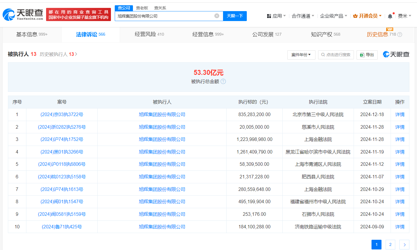 旭辉集团股份有限公司成立于2000年8月,法定代表人为傅珮,注册资本35亿人民币,由上海旭辉投资咨询有限公司、旭凯(上海)投资顾问有限公司共同持股。天眼风险信息显示,该公司现存13条被执行人信息,被执行总金额超53亿元。