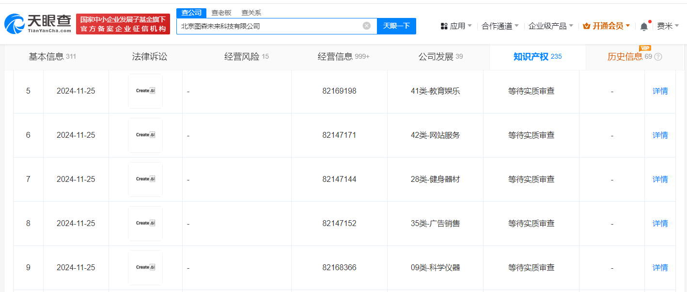 天眼查知识产权信息显示,近日,北京图森未来科技有限公司申请注册多枚“Create AI”商标,国际分类含教育娱乐、网站服务、广告销售等,目前商标状态均为等待实质审查。