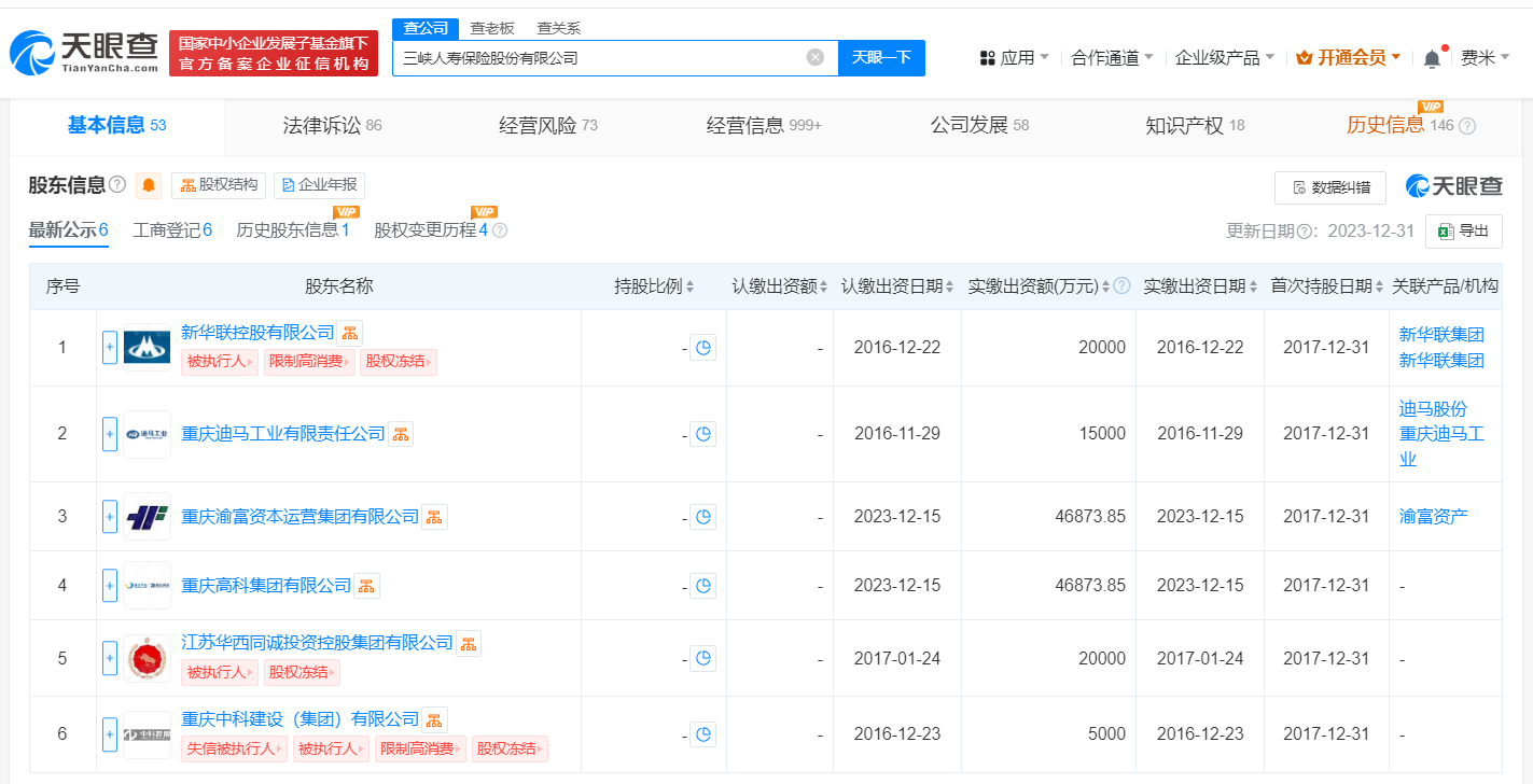 三峡人寿保险股份有限公司成立于2017年12月,法定代表人为张君,经营范围含普通型保险、健康保险、意外伤害保险等,由新华联控股有限公司、重庆迪马工业有限责任公司、重庆渝富资本运营集团有限公司等共同持股。
