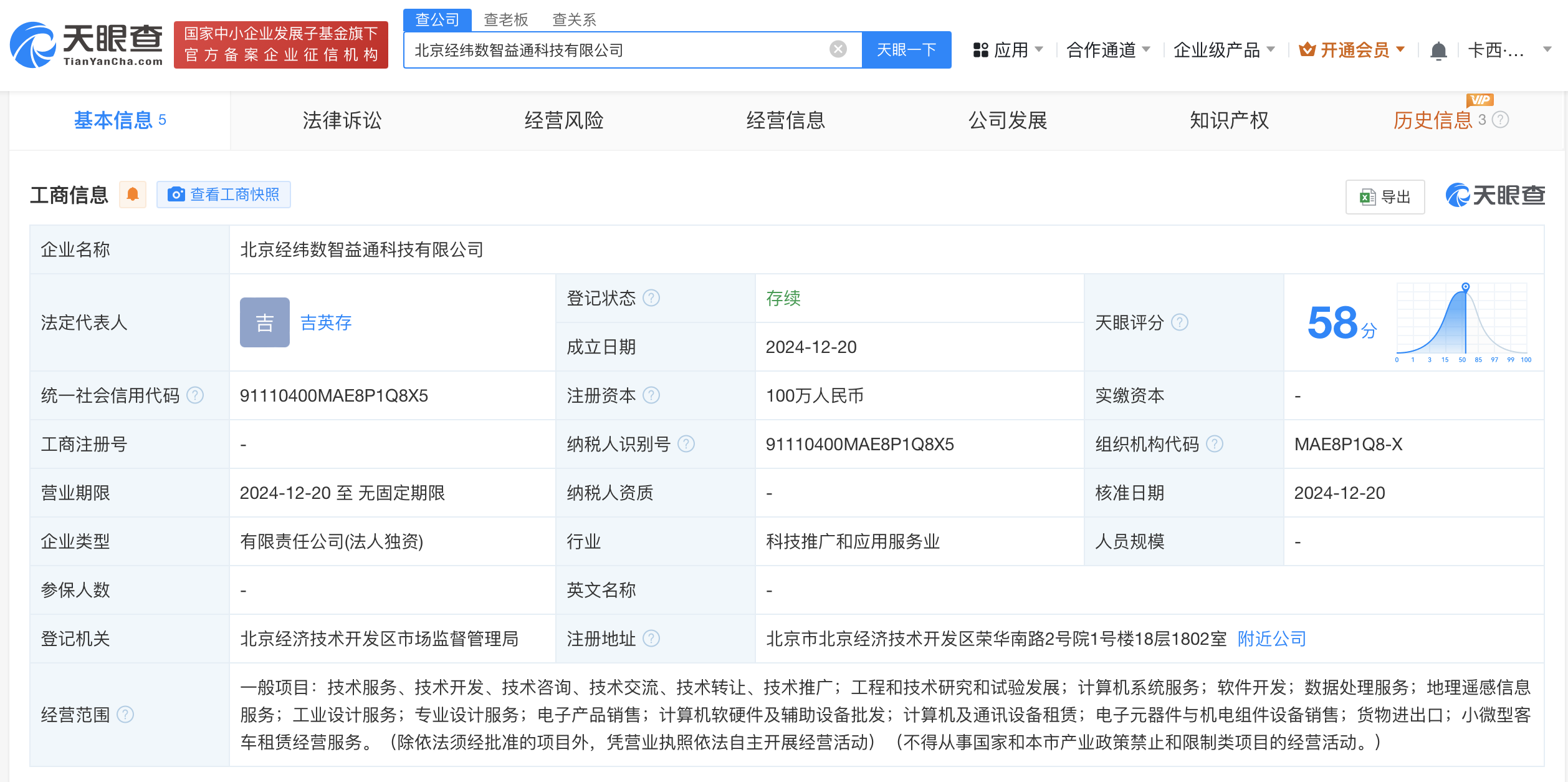 天眼查App显示,近日,北京经纬数智益通科技有限公司成立,法定代表人为吉英存,注册资本100万人民币,经营范围含工程和技术研究和试验发展、计算机系统服务、软件开发、数据处理服务、地理遥感信息服务等。股东信息显示,该公司由经纬恒润(688326)全资持股。