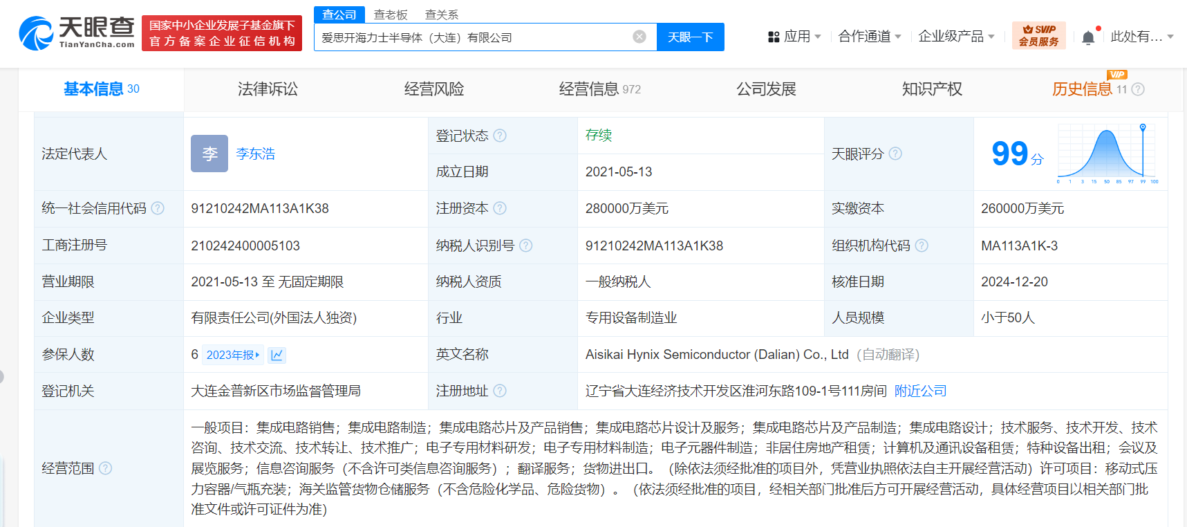 该公司成立于2021年5月,法定代表人为李东浩,经营范围含集成电路销售、集成电路制造、集成电路芯片及产品销售、集成电路芯片设计及服务、集成电路芯片及产品制造、集成电路设计、电子专用材料研发等。股东信息显示,该公司由SK海力士株式会社全资持股。