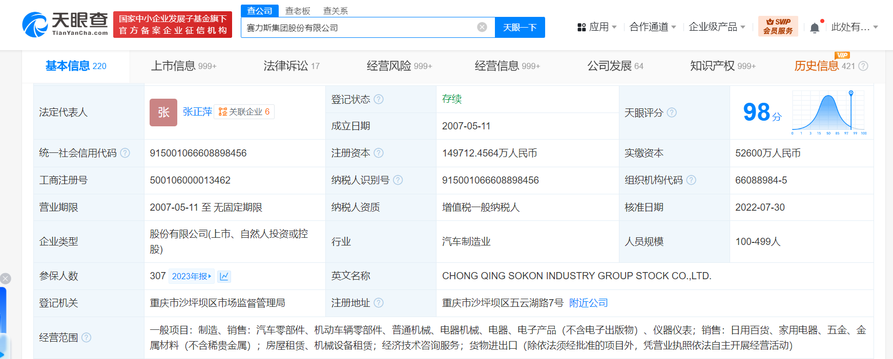 赛力斯集团股份有限公司成立于2007年5月,法定代表人为张正萍,注册资本约14.97亿人民币,由重庆小康控股有限公司、东风汽车集团有限公司、重庆渝安汽车工业有限公司等共同持股。