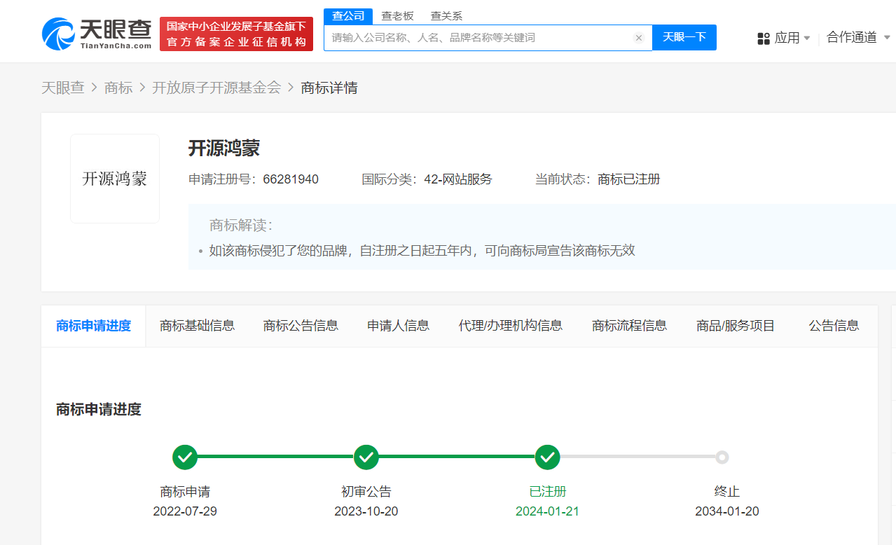 天眼查知识产权信息显示,近日,华为技术有限公司将其持有的两枚“开源鸿蒙”商标转让至开放原子开源基金会,国际分类为网站服务,上述商标分别申请于2022年7月、2022年10月。