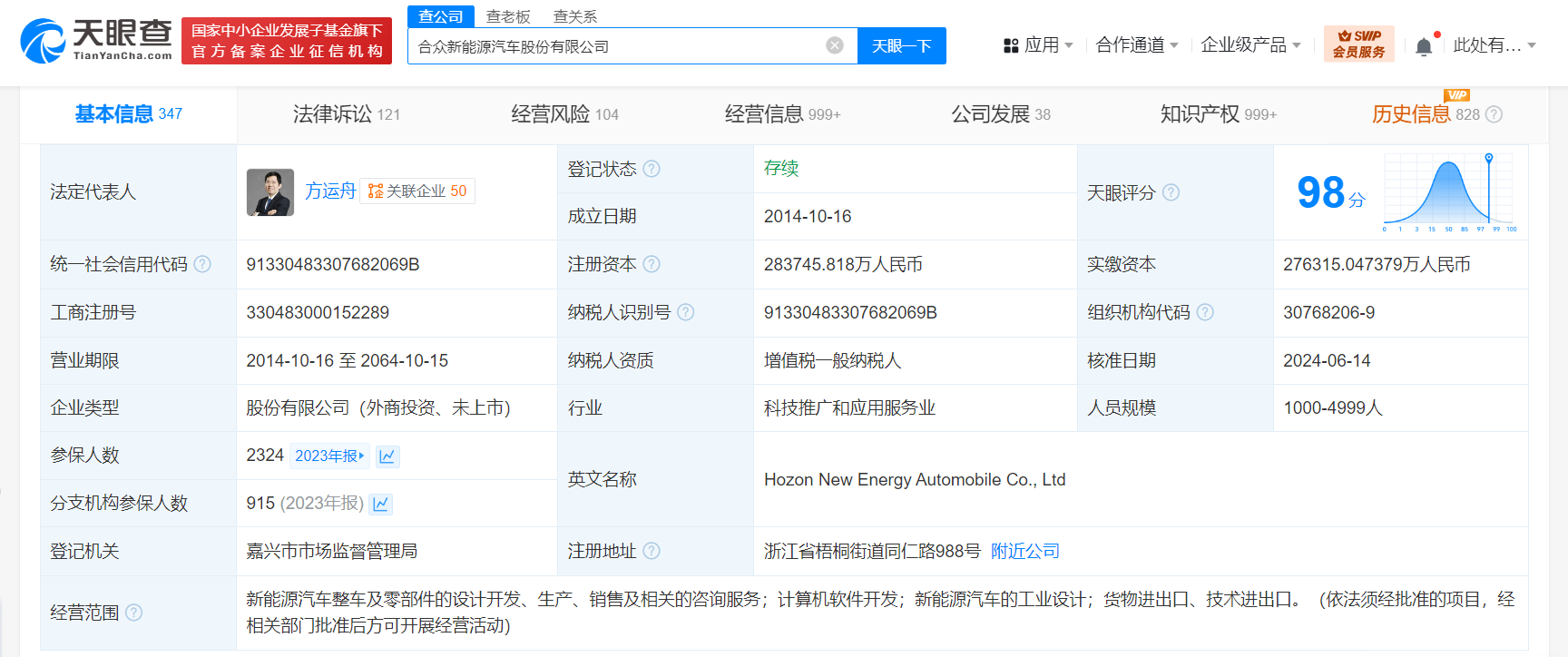 天眼查法律诉讼信息显示,近日,方运舟新增一则股权冻结信息,股权被执行的企业为合众新能源汽车股份有限公司,冻结股权数额1986万人民币,冻结期限自2024年12月18日至2027年12月17日,执行法院为桐乡市人民法院。