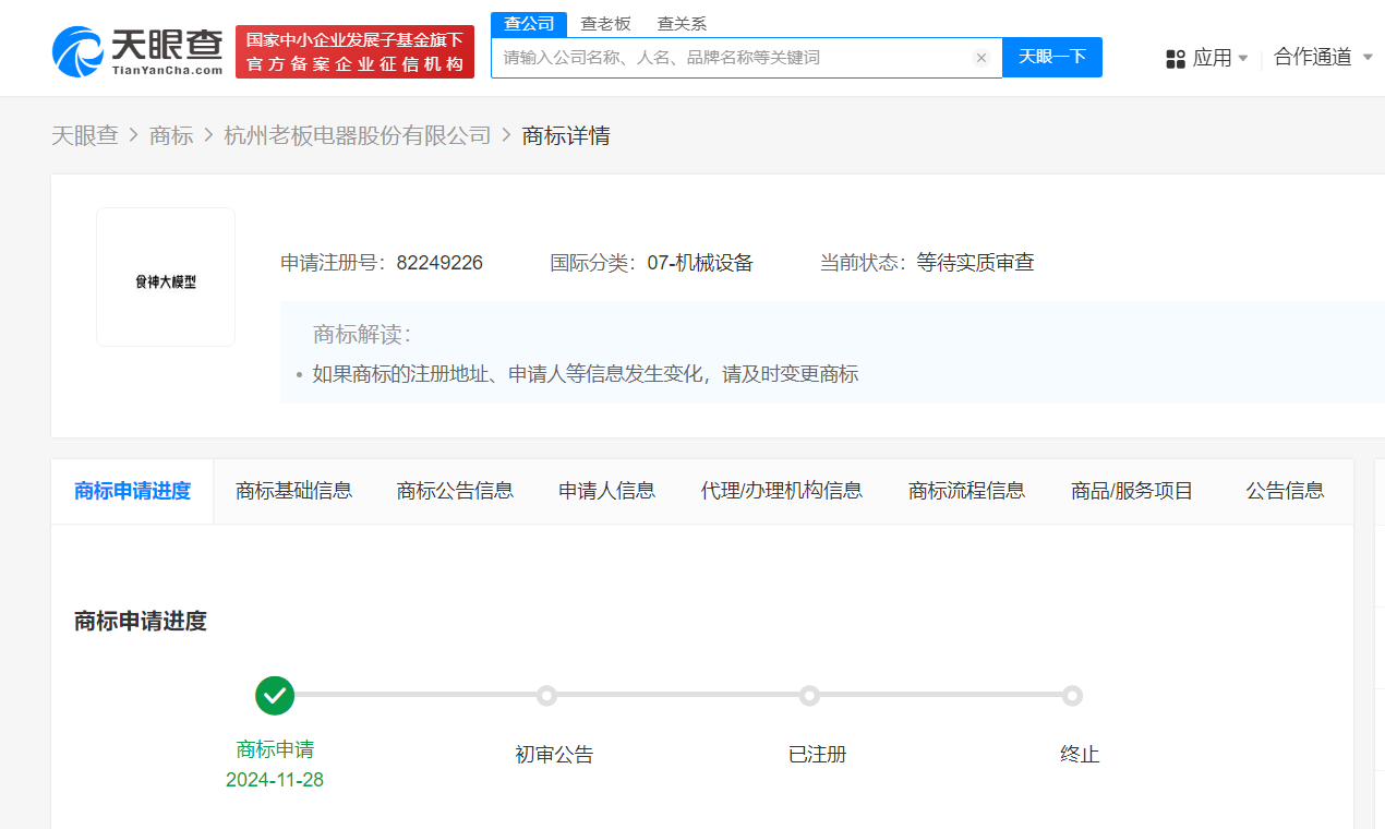 天眼查知识产权信息显示,近日,老板电器(002508)申请注册两枚“食神大模型”商标,国际分类为机械设备、灯具空调,当前商标状态均为等待实质审查。