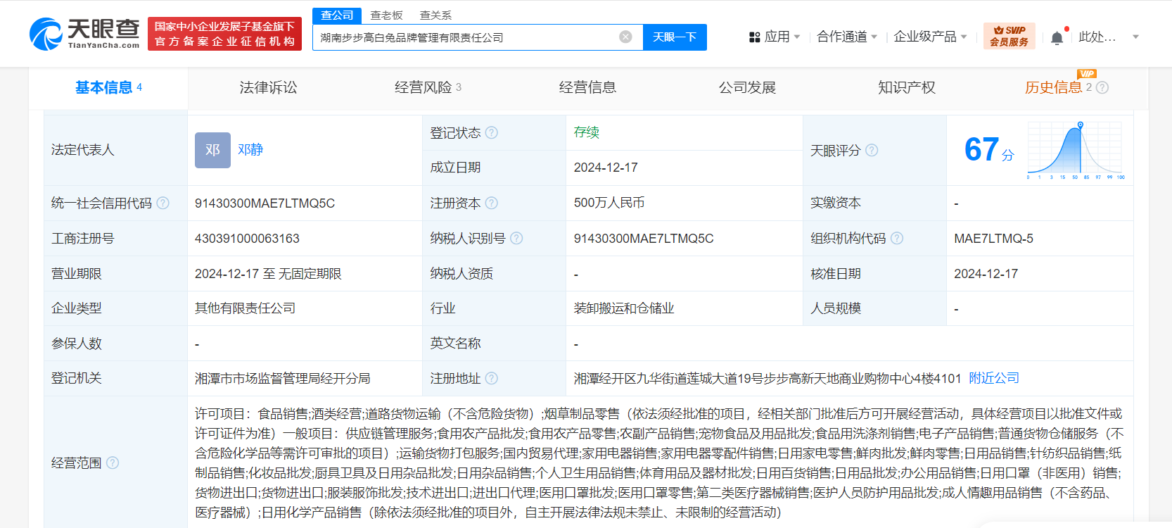 天眼查App显示,近日,湖南步步高白兔品牌管理有限责任公司成立,法定代表人为邓静,注册资本500万人民币,经营范围含食品销售、供应链管理服务、运输货物打包服务、国内贸易代理、家用电器销售、货物进出口、技术进出口、进出口代理等。股东信息显示,该公司由ST步步高(002251)、成都白兔有你文化传播有限公司分别持股60%、40%。