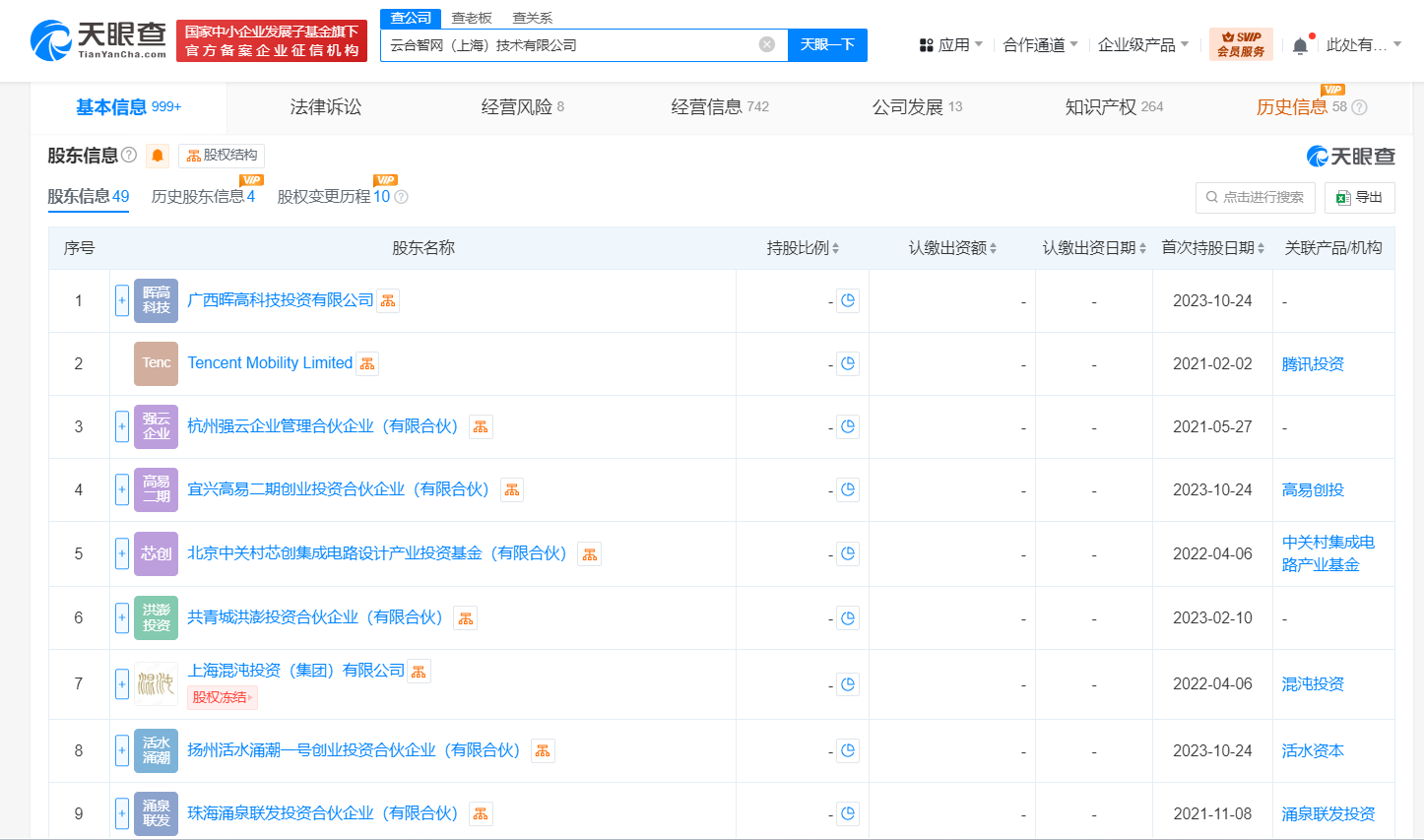 云合智网(上海)技术有限公司成立于2020年11月,法定代表人为陈清华,经营范围含集成电路设计、软件开发、信息系统集成服务、计算机软硬件及辅助设备批发、货物进出口、技术进出口等。股东信息显示,该公司现由Tencent Mobility Limited、杭州强云企业管理合伙企业(有限合伙)、北京中关村芯创集成电路设计产业投资基金(有限合伙)等及上述新增股东共同持股。