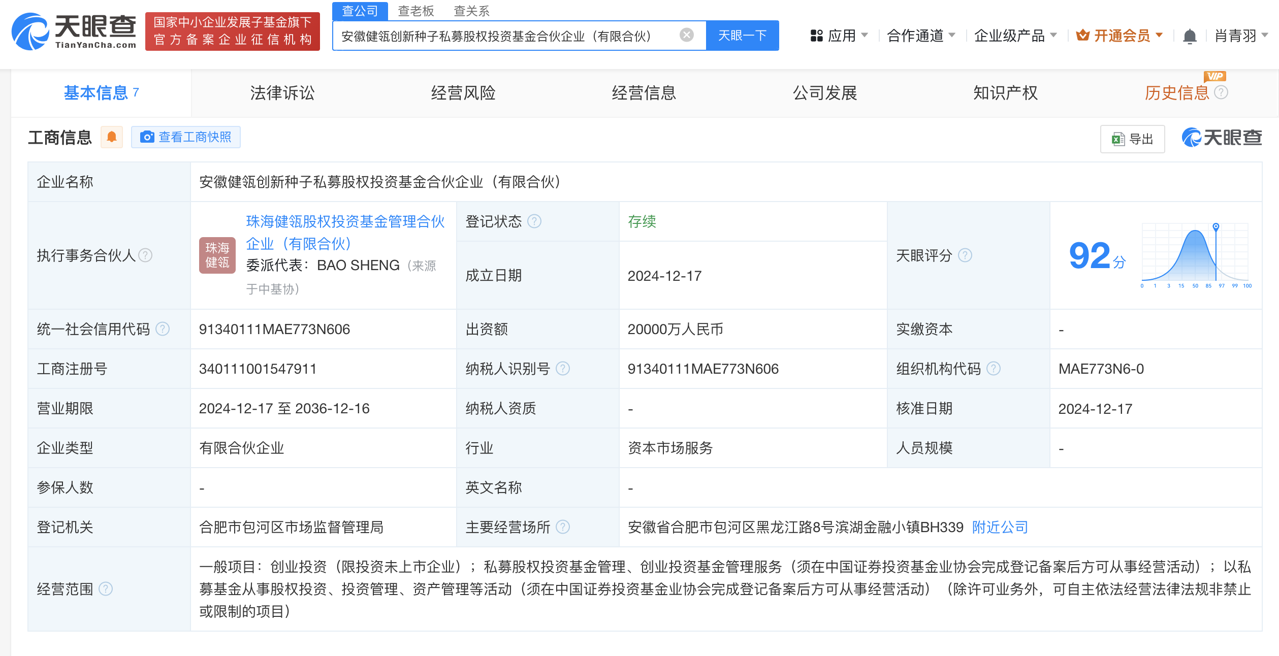 天眼查App显示,近日,安徽健瓴创新种子私募股权投资基金合伙企业(有限合伙)成立,执行事务合伙人为珠海健瓴股权投资基金管理合伙企业(有限合伙),出资额2亿人民币,经营范围含私募股权投资基金管理、创业投资基金管理服务等。合伙人信息显示,该基金由伊利股份(600887)旗下健瓴(珠海)母基金合伙企业(有限合伙)、深圳市健瓴创新种子私募股权投资基金合伙企业(有限合伙)、珠海健瓴股权投资基金管理合伙企业(有限合伙)及安徽省种子基金二期合伙企业(有限合伙)共同出资。