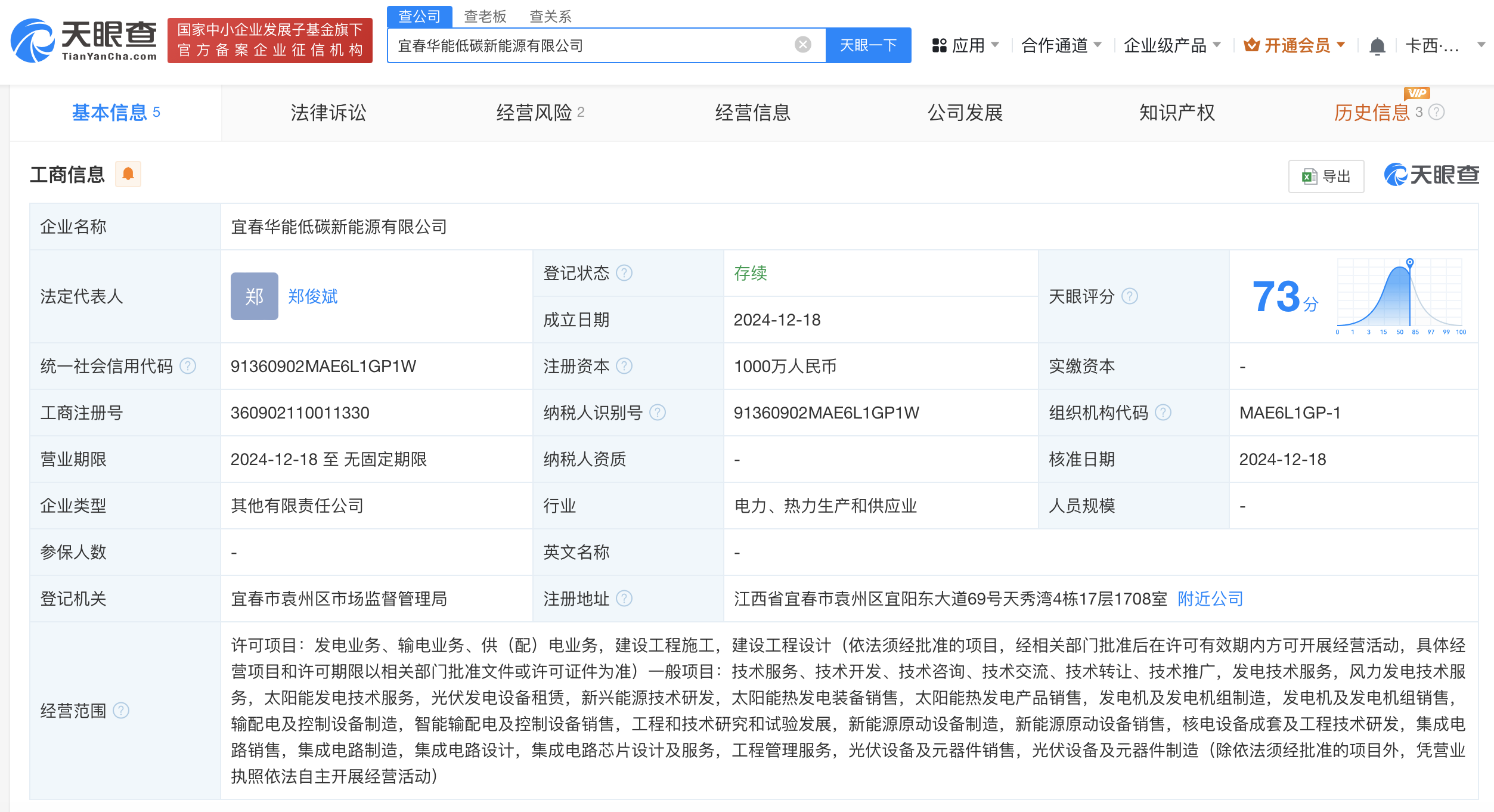 天眼查App显示,近日,宜春华能低碳新能源有限公司成立,法定代表人为郑俊斌,注册资本1000万人民币,经营范围含风力发电技术服务、太阳能发电技术服务、光伏发电设备租赁、新兴能源技术研发等。股东信息显示,该公司由华能新能源股份有限公司、宜春思禾新能源有限公司分别持股70%、30%。