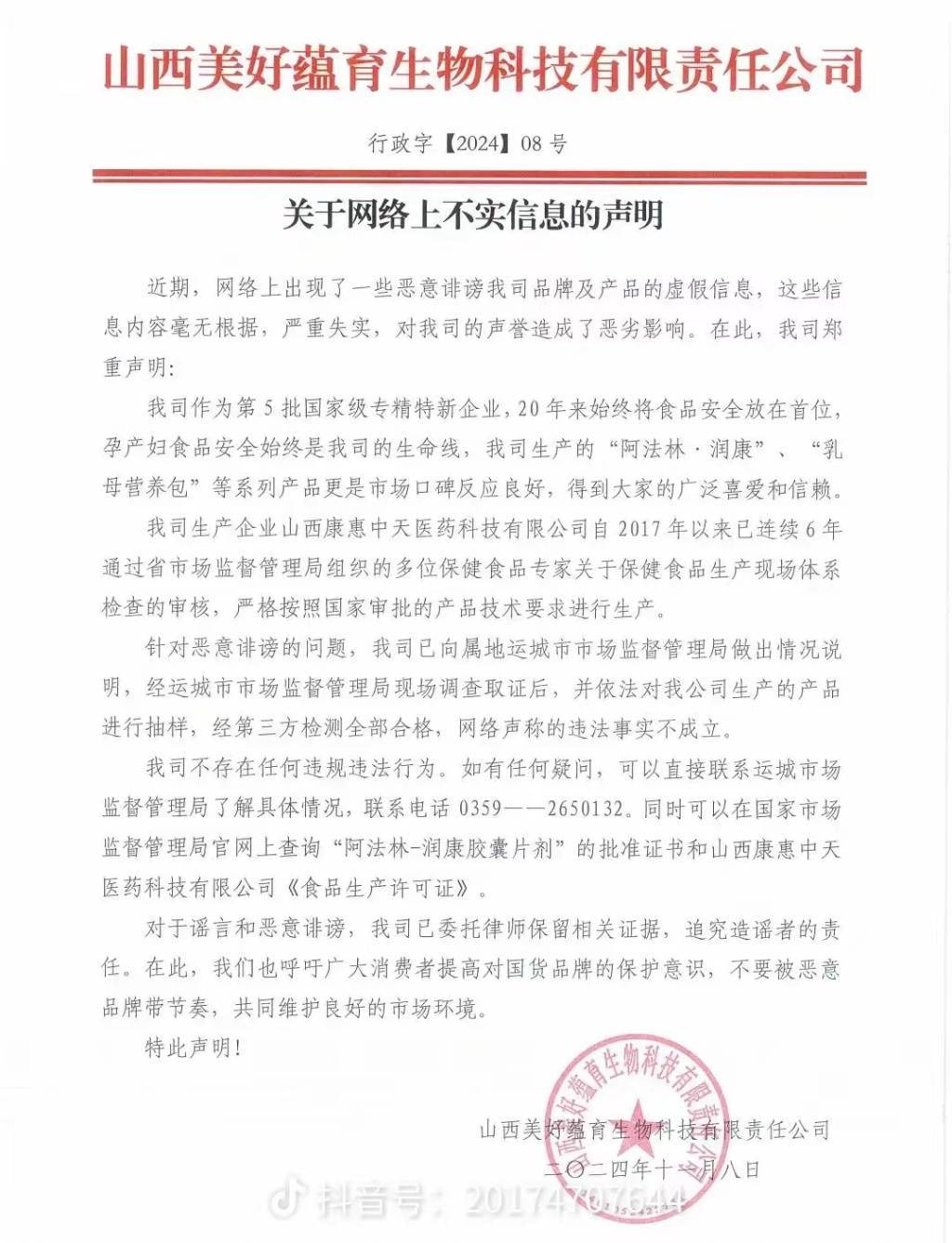 与此同时,澎湃新闻记者注意到,一份盖有“山西美好蕴育生科技有限责任公司”印章、落款时间为2024年10月8日的《关于网络上不实信息的声明》(以下简称《声明》)在网络上传播。