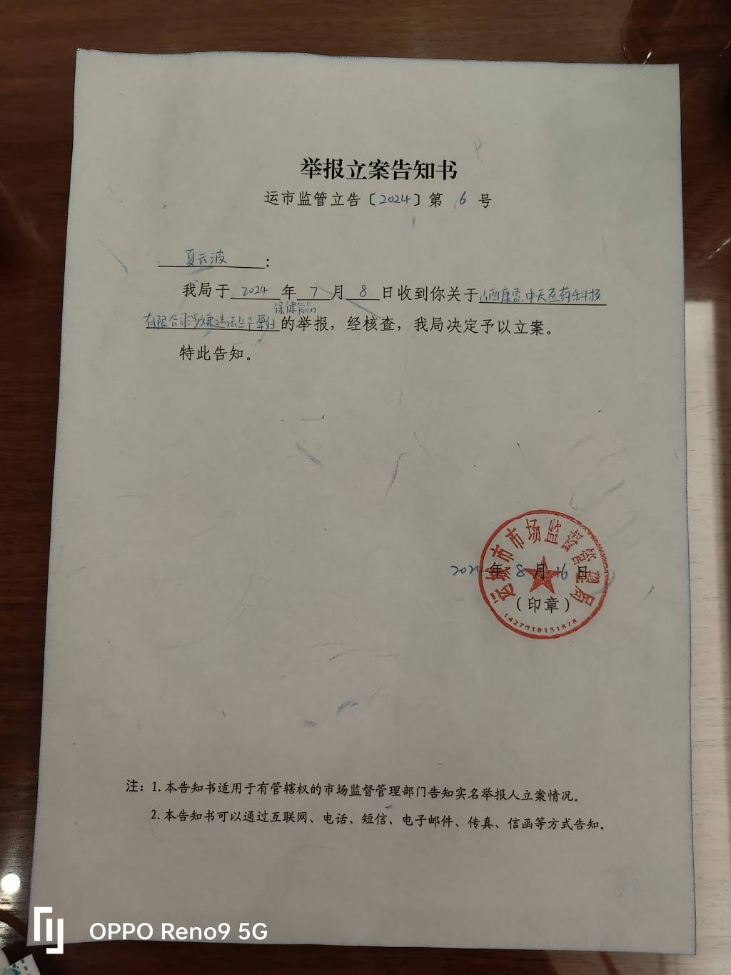 刘博称,8月19日接到运城市场监督管理局的通知,他的相关举报已立案。他提供的《举报立案告知书》显示,2024年7月8日,运城市监局收到关于“康惠中天”涉嫌违法生产孕妇保健食品的举报。经核查,该局决定予以立案。《告知书》落款时间为8月16日。