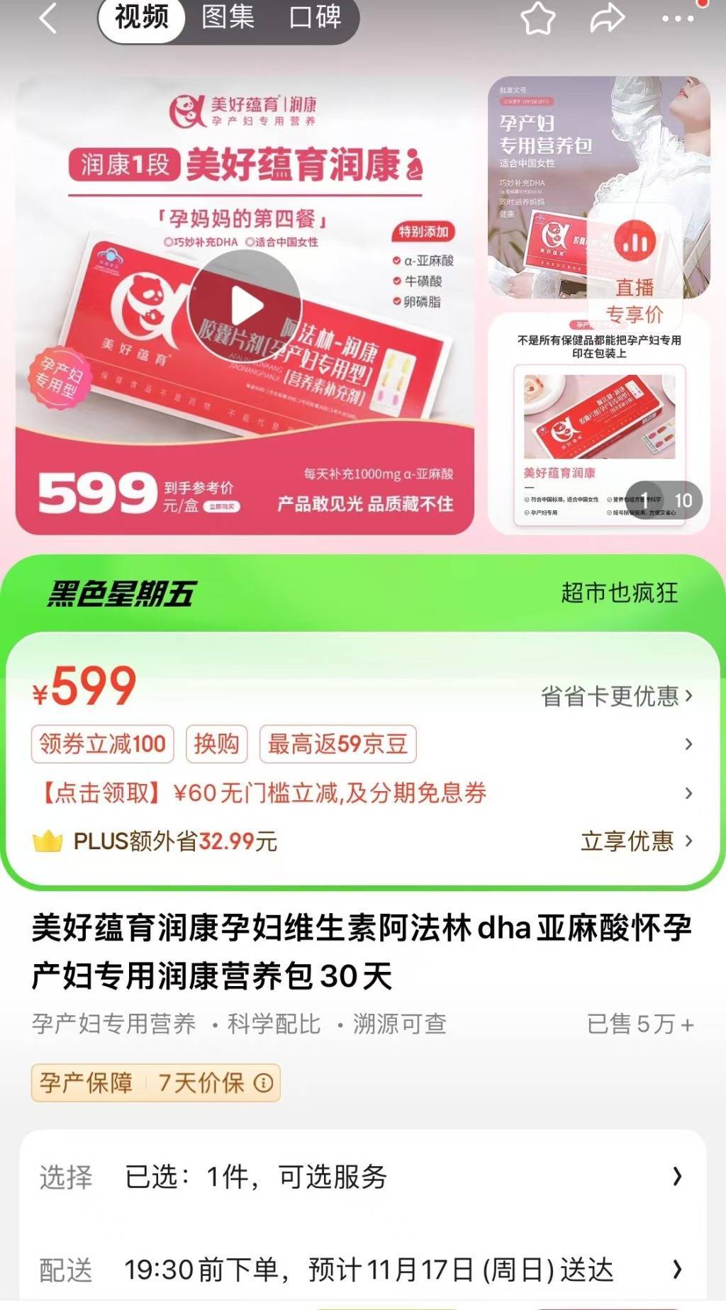 淘宝“美好蕴育旗舰店”显示,阿法林-润康胶囊片剂售价599元,店铺显示已售“2万+”件,“一周内900+人已买”“超4千回头客”。而京东“美好蕴育官方旗舰店”,这一产品“已售5万+”,评论也有“5万+”条。
