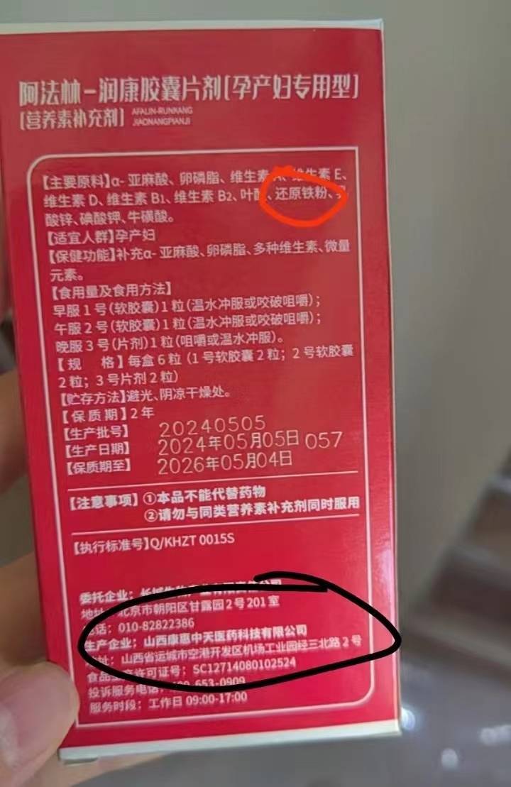 近日,来自山西的消费者刘博向澎湃公众互动平台“服务湃”反映称,一款名为“美好蕴育 阿法林-润康胶囊片剂(孕产妇专用型)(营养素补充剂)”的孕产妇保健品,未按配方生产。为此他将涉事公司——山西康惠中天医药科技有限公司(以下简称“康惠中天”)举报至运城市场监督管理局,目前已立案。