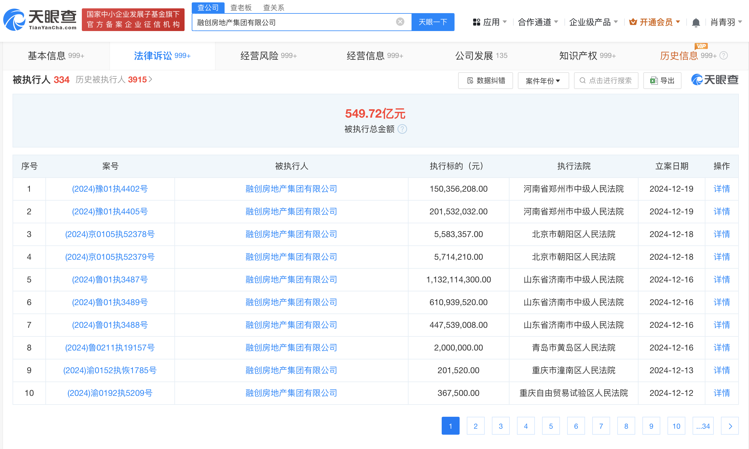 天眼风险信息显示,融创房地产集团有限公司现存330余条被执行人信息,被执行总金额超549亿元。此外,该公司还存在多条限制消费令、失信被执行人(老赖)和终本案件信息。