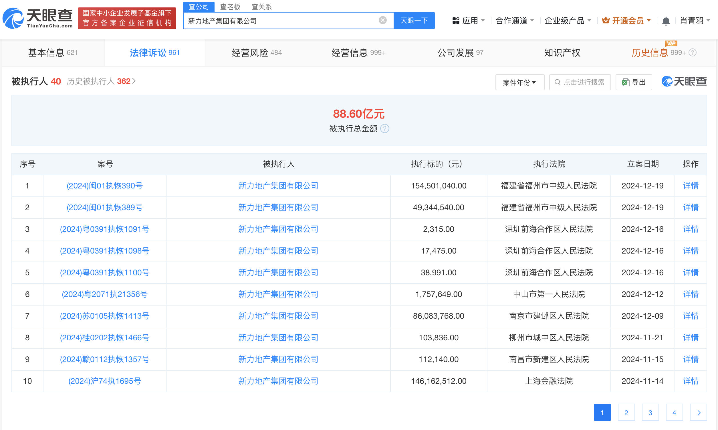 天眼风险信息显示,新力地产集团有限公司现存40条被执行人信息,被执行总金额超88亿元。此外,该公司还存在多条股权冻结、限制消费令及终本案件信息。