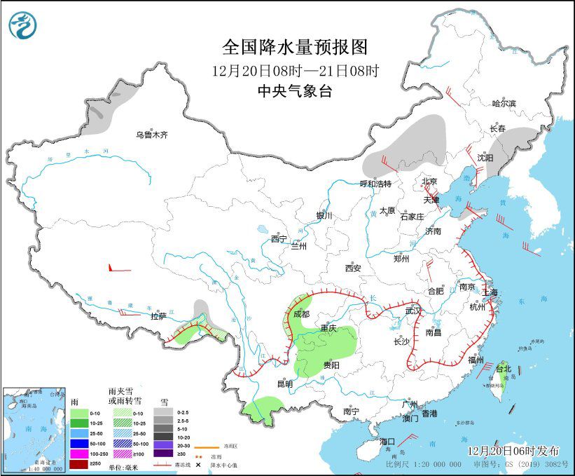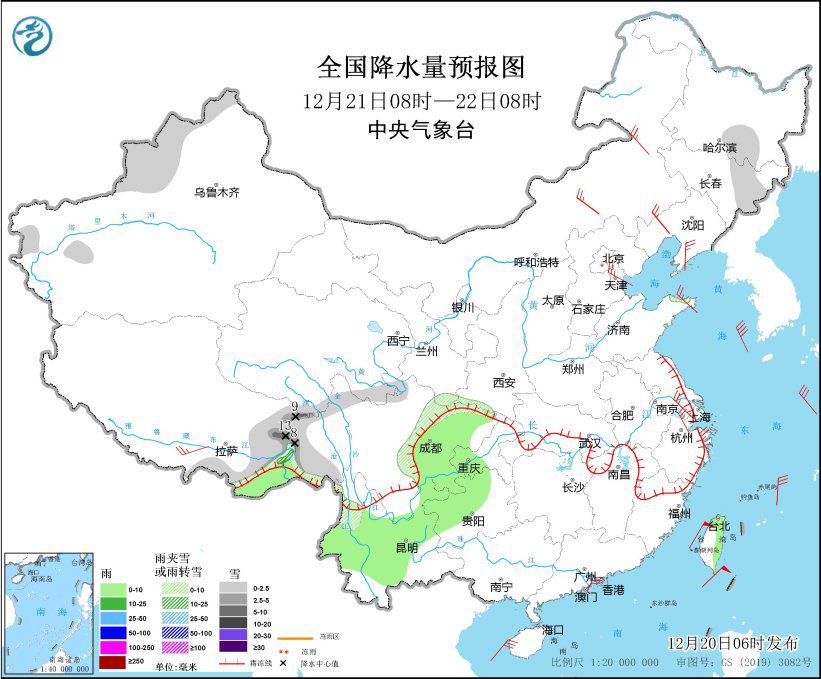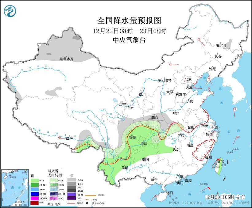 12月22日8时至23日8时,新疆北部、西藏东南部、川西高原北部、云南西北部、陕西南部、湖北中西部、河南西部和南部等地部分地区有小到中雪或雨夹雪。四川盆地、重庆大部、贵州中北部、云南西部和中北部、湖南中西部、台湾岛东部等地部分地区有小雨。西藏南部、内蒙古中东部、辽东半岛、山东半岛、浙江中东部等地部分地区有4~5级风;黄海中南部海域、东海南部海域、台湾海峡、台湾以东洋面、南海大部海域将有7~8级、阵风9~10级的大风。
