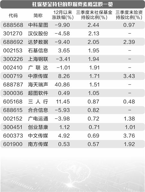 多只概念股获得耐心资本青睐,三季报数据显示,15股在今年三季度末获得社保基金重仓,20股获得保险资金重仓,其中同时获得社保基金、保险资金重仓的共有8股,包括中原传媒、达梦数据、中科星图等。