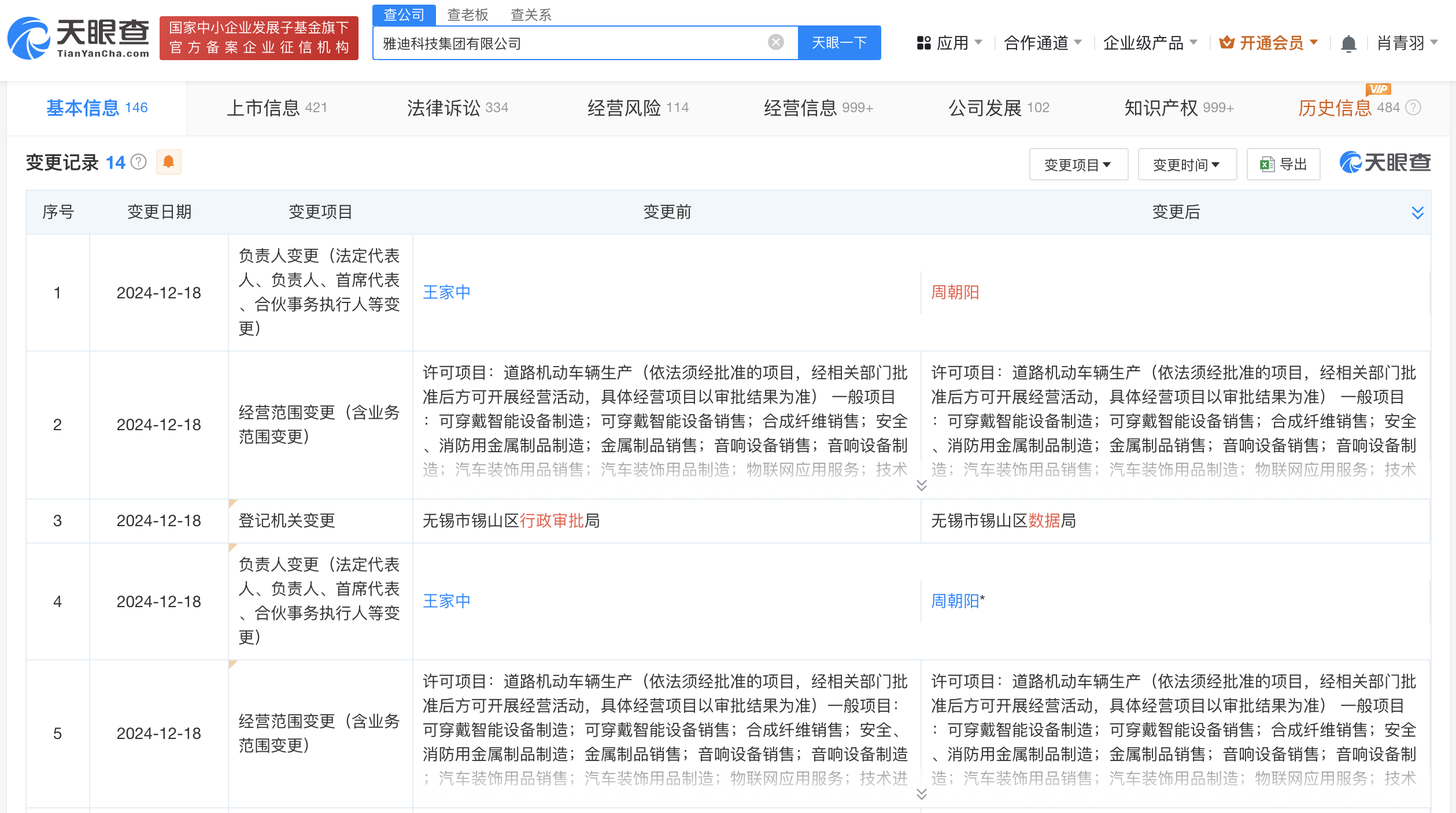 天眼查App显示,近日,雅迪科技集团有限公司发生工商变更,王家中卸任法定代表人、执行董事,由周朝阳任法定代表人、执行公司事务的董事。
