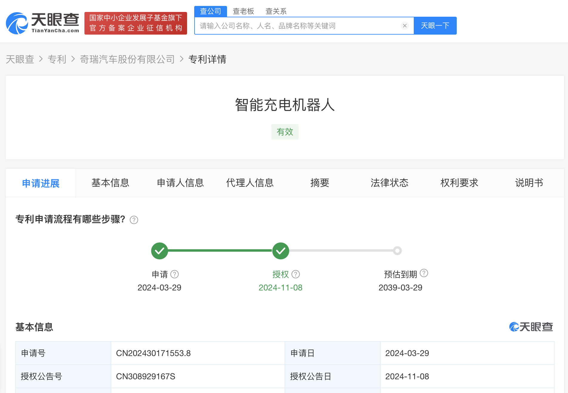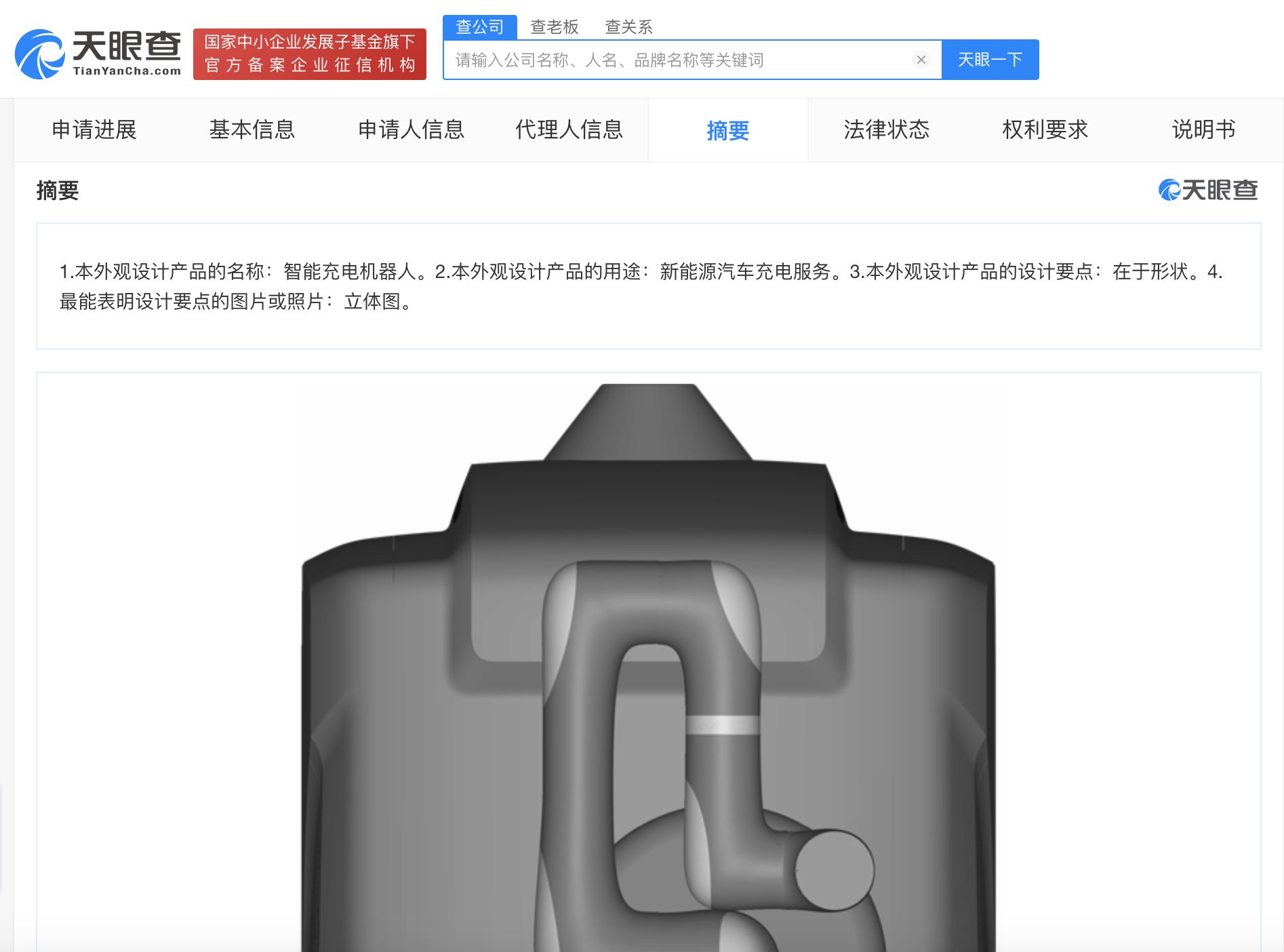 天眼查知识产权信息显示,近期,奇瑞汽车股份有限公司申请的“智能充电机器人”外观专利获授权。摘要显示,该外观设计产品的名称为智能充电机器人,主要用于新能源汽车充电服务。