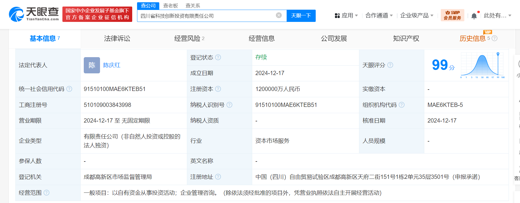 天眼查App显示,近日,四川省科技创新投资有限责任公司成立,法定代表人为陈庆红,注册资本120亿人民币,经营范围为以自有资金从事投资活动、企业管理咨询。股东信息显示,该公司由四川发展(控股)有限责任公司全资持股。