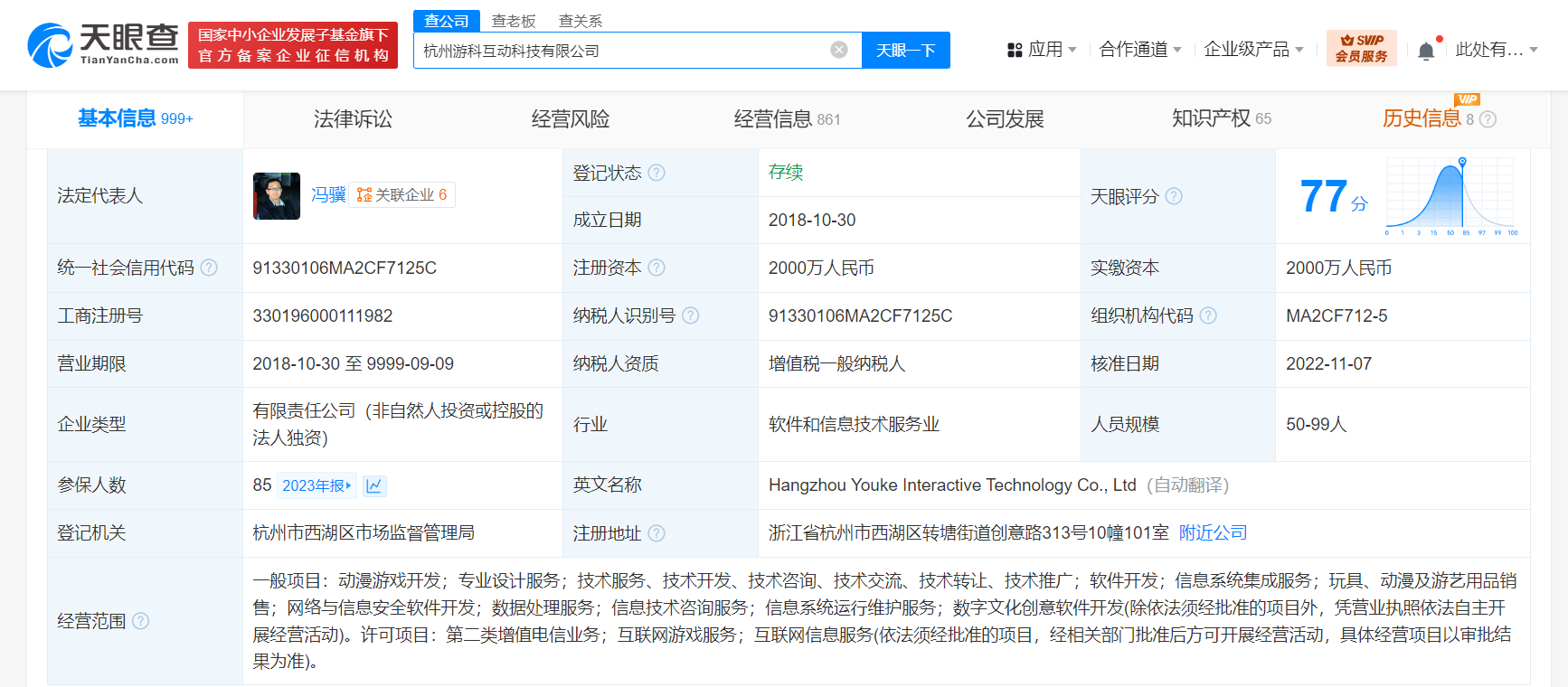 杭州游科互动科技有限公司成立于2018年10月,法定代表人、董事长、经理为冯骥,注册资本2000万人民币,由深圳市游科互动科技有限公司全资持股。