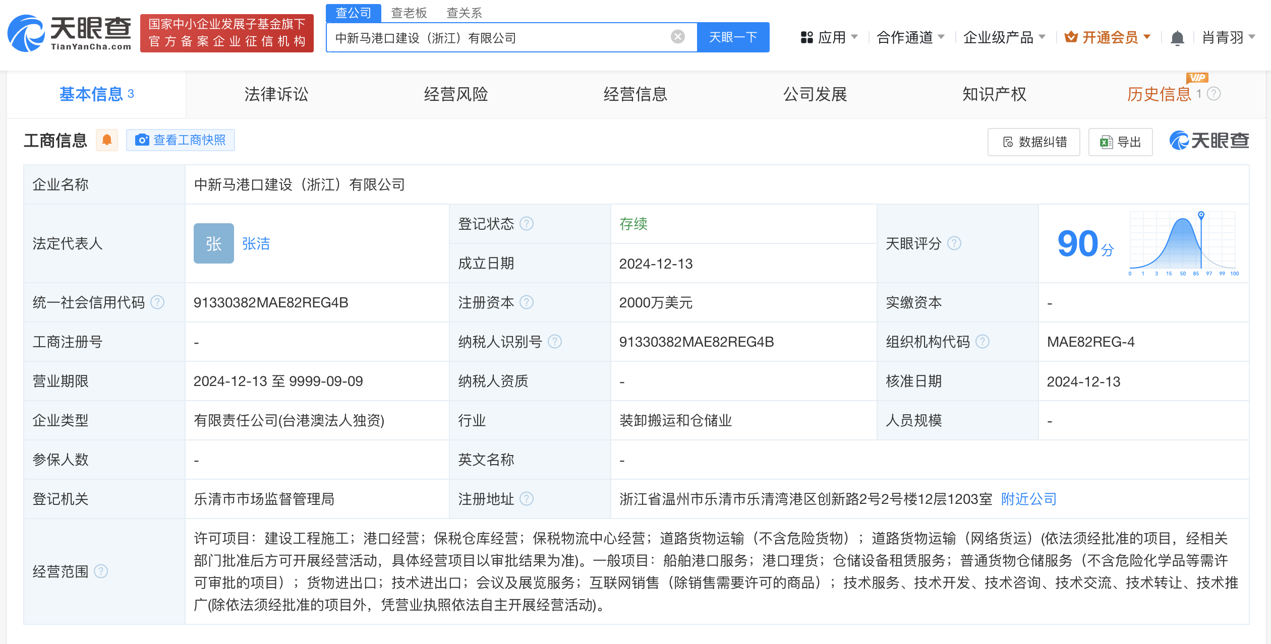 天眼查App显示,近日,中新马港口建设(浙江)有限公司成立,法定代表人为张洁,注册资本2000万美元,经营范围含建设工程施工、港口经营、保税仓库经营、保税物流中心经营、道路货物运输等。股东信息显示,该公司由中国港口控股集团有限公司全资持股。