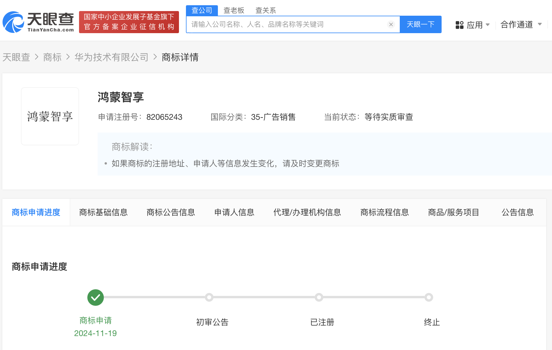 天眼查知识产权信息显示,近日,华为技术有限公司申请注册多枚“鸿蒙智享”“鸿蒙活力”“鸿蒙影音”等商标,国际分类涉及广告销售、通讯服务、网站服务等,当前商标状态均为等待实质审查。