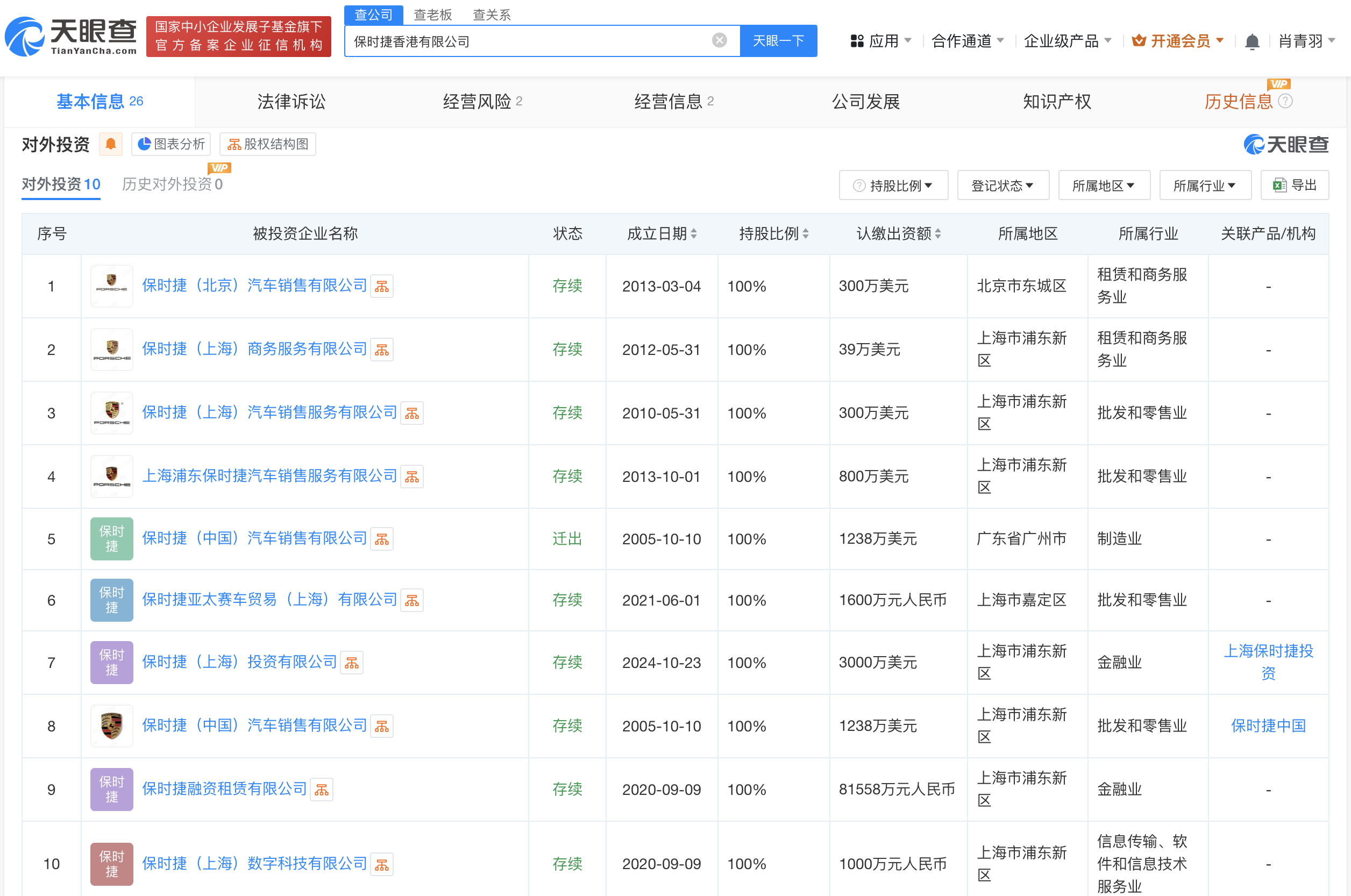 此外,保时捷香港有限公司共对外投资10家公司,除上述公司外,还包括保时捷(北京)汽车销售有限公司、保时捷(上海)商务服务有限公司、保时捷融资租赁有限公司等。