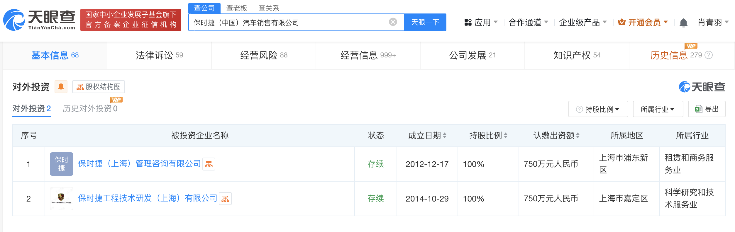 天眼查App显示,保时捷中国关联公司保时捷(中国)汽车销售有限公司成立于2005年10月,法定代表人为ALEXANDER HANS-JOSEF POLLICH,注册资本1238万美元,经营范围含汽车销售、汽车零配件批发、汽车零配件零售、体验式拓展活动及策划、货物进出口、销售代理、进出口代理等,由保时捷香港有限公司全资持股。对外投资信息显示,该公司全资持股保时捷(上海)管理咨询有限公司、保时捷工程技术研发(上海)有限公司。