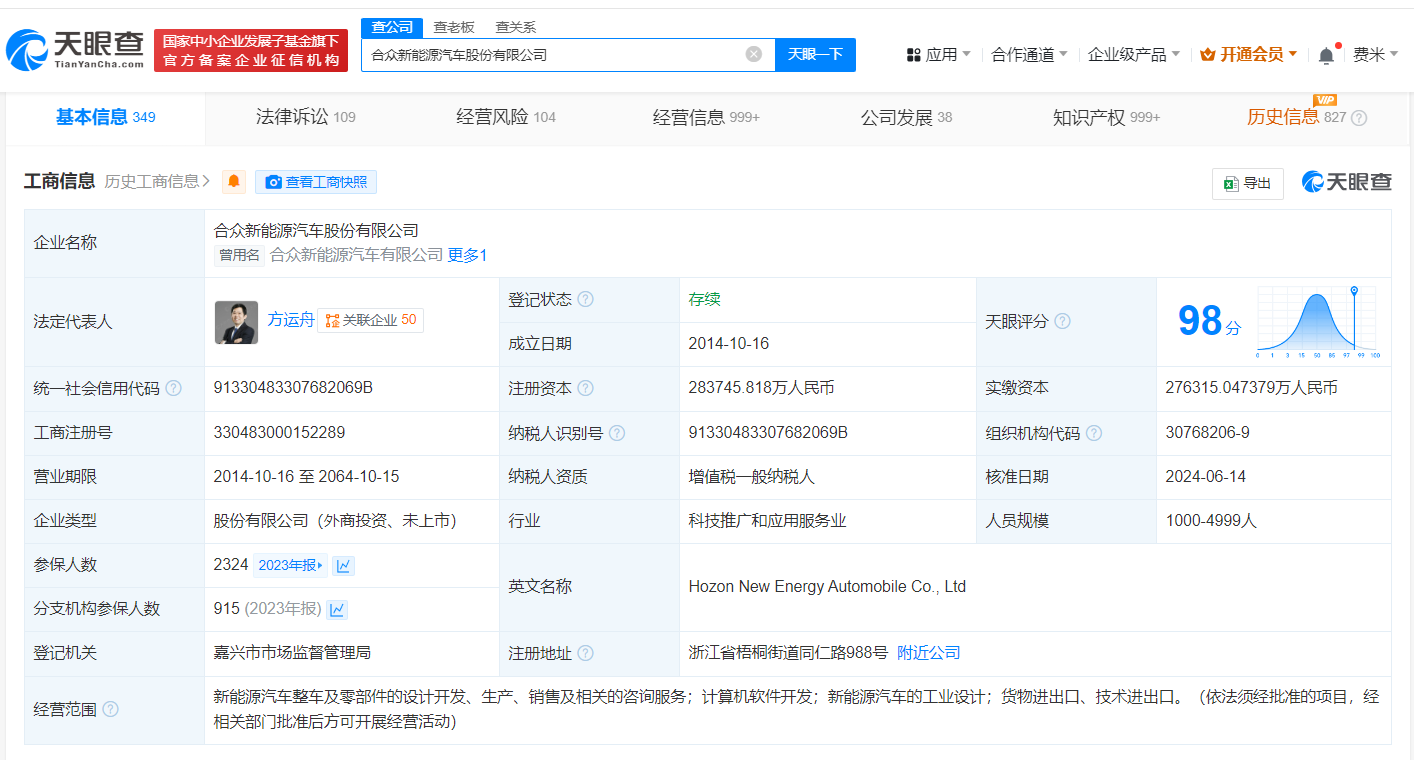 天眼查法律诉讼信息显示,12月16日,哪吒汽车关联公司合众新能源汽车股份有限公司新增一则股权冻结信息,股权被执行的企业为众联天下汽车销售服务有限公司,冻结股权数额约1.7亿人民币,冻结期限自2024年12月16日至2027年12月15日,执行法院为浙江省嘉兴市中级人民法院。