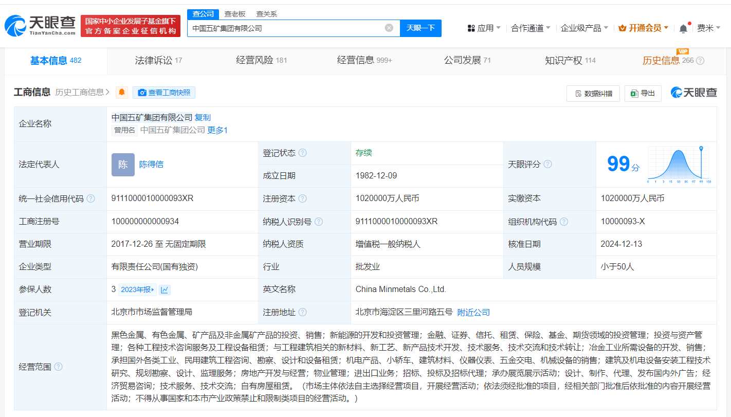 中国五矿集团有限公司成立于1982年12月,注册资本102亿人民币,经营范围含黑色金属、有色金属、矿产品及非金属矿产品的投资、销售等,由国务院国有资产监督管理委员会全资持股。据报道,中国五矿集团官网12月6日发布消息,集团当天上午召开中层以上管理人员大会,宣布陈得信任中国五矿集团董事长、党组书记,免去其集团总经理职务。
